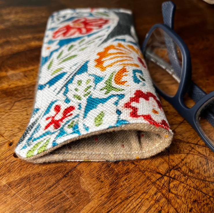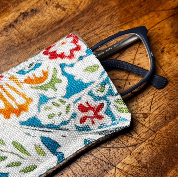 Slip-in slim glasses case in an offcut of colourful linen. The lightly padded pocket is lined with soft brushed cotton.