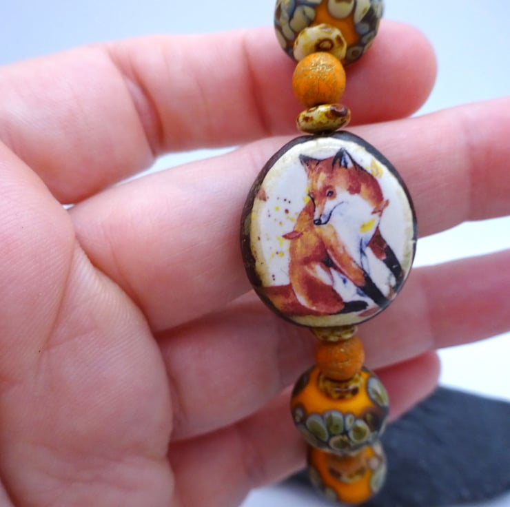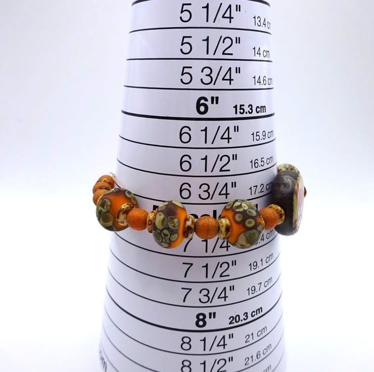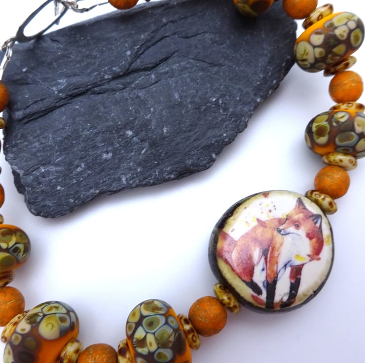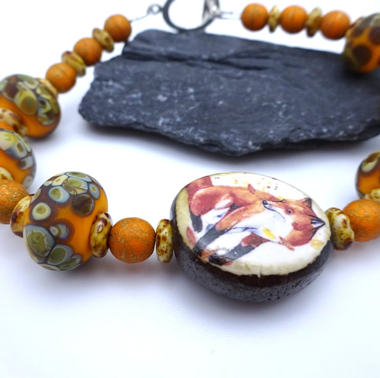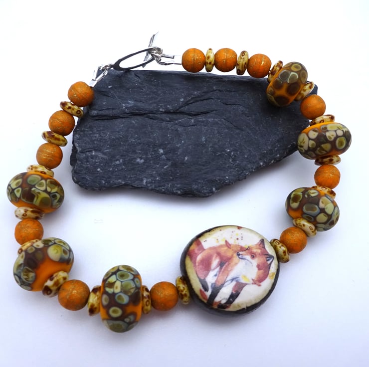 A bracelet made with handmade orange lampwork glass beads, Czech glass beads and a handmade ceramic fox bead. The bracelet fastens with a sterling silver toggle clasp.
