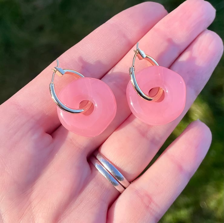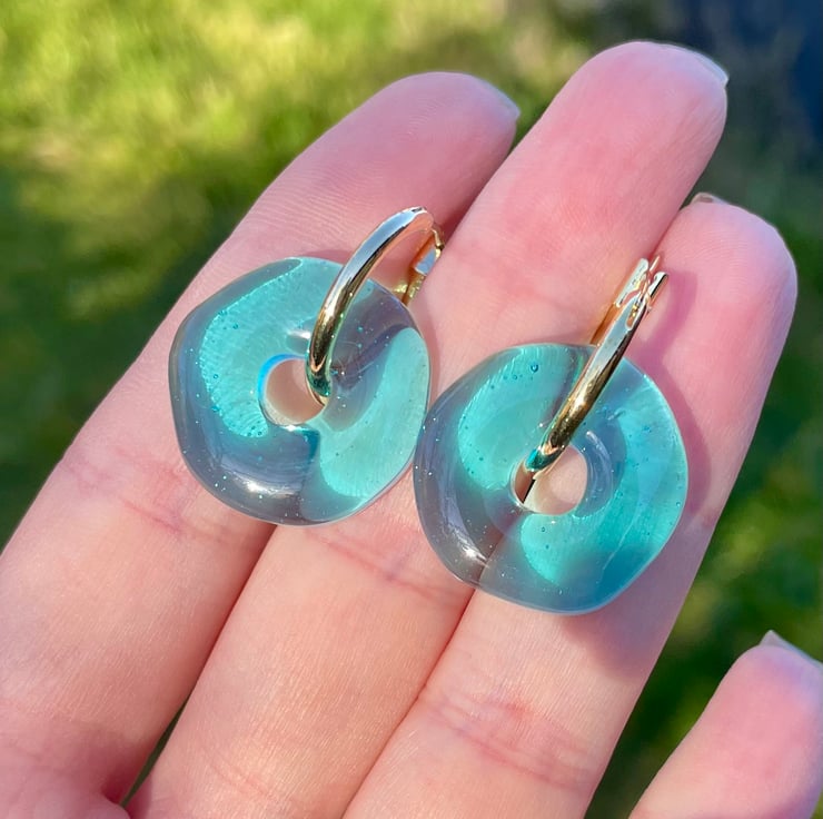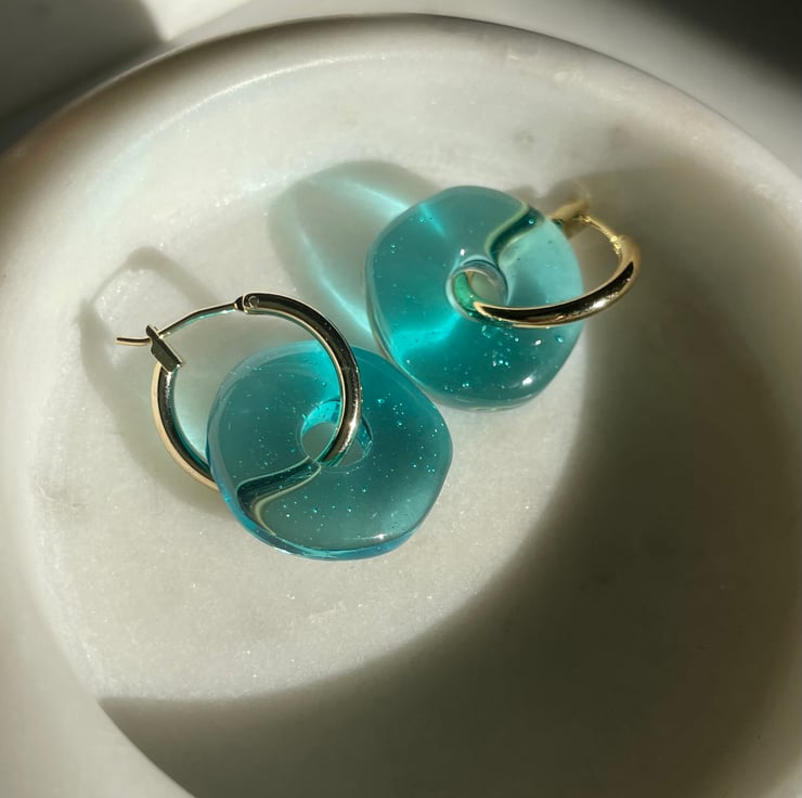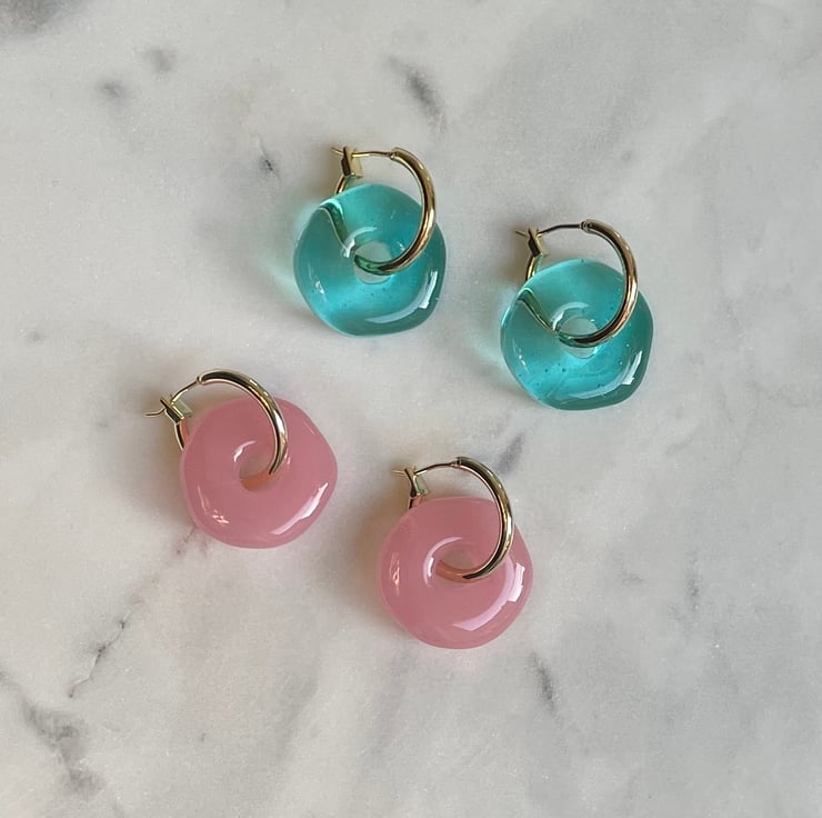 Gold-plated hoops with chunky resin charm. Available in bright peachy pink or transluscent blue-green.
