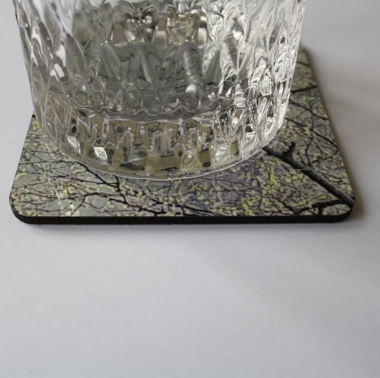 1 willow branch print coaster in calming, muted tones. The coaster measures 10cm x 10cm and is 3mm thick. Made from hard wearing mdf with a glossy finish and cork backing. Designed and printed by Beyond the field designs in the Staffordshire Moorlands using my original photographic design.