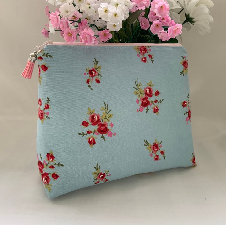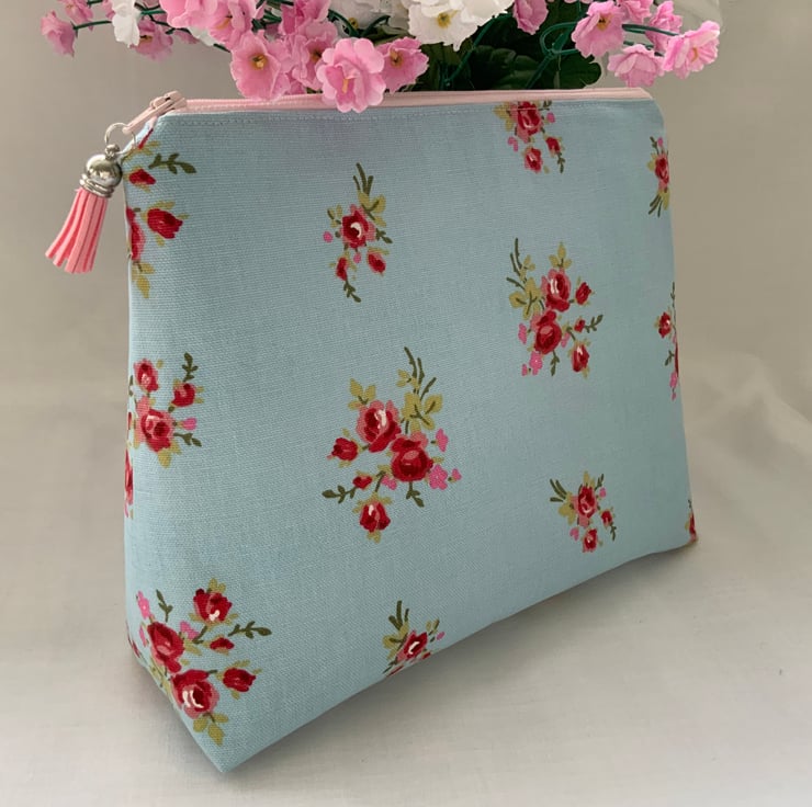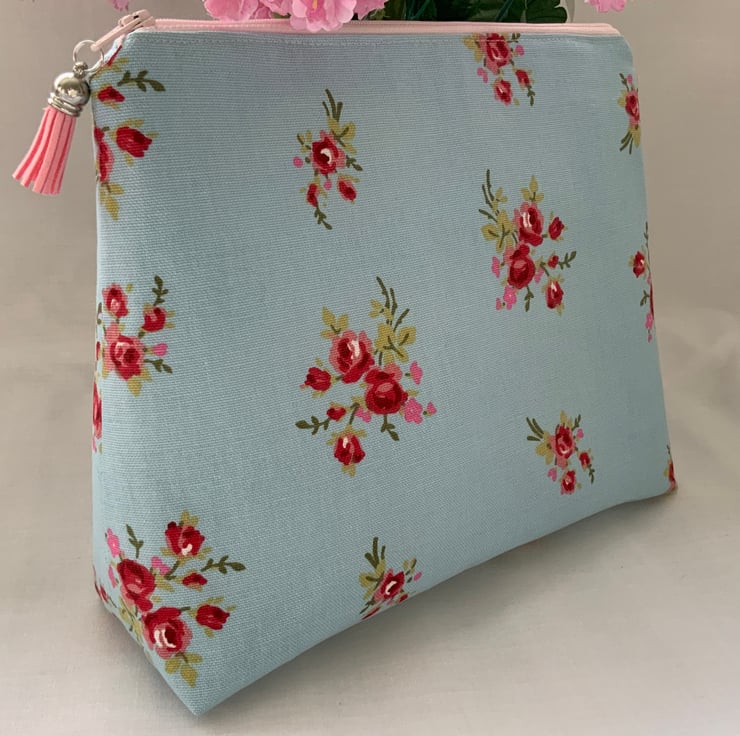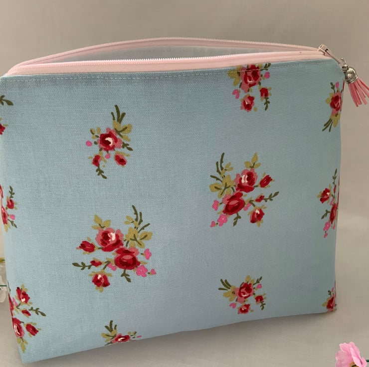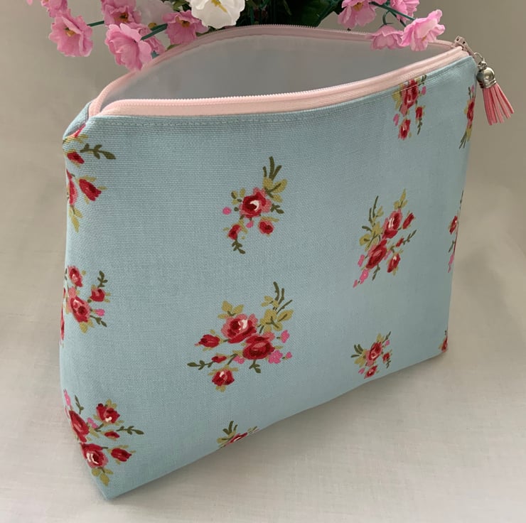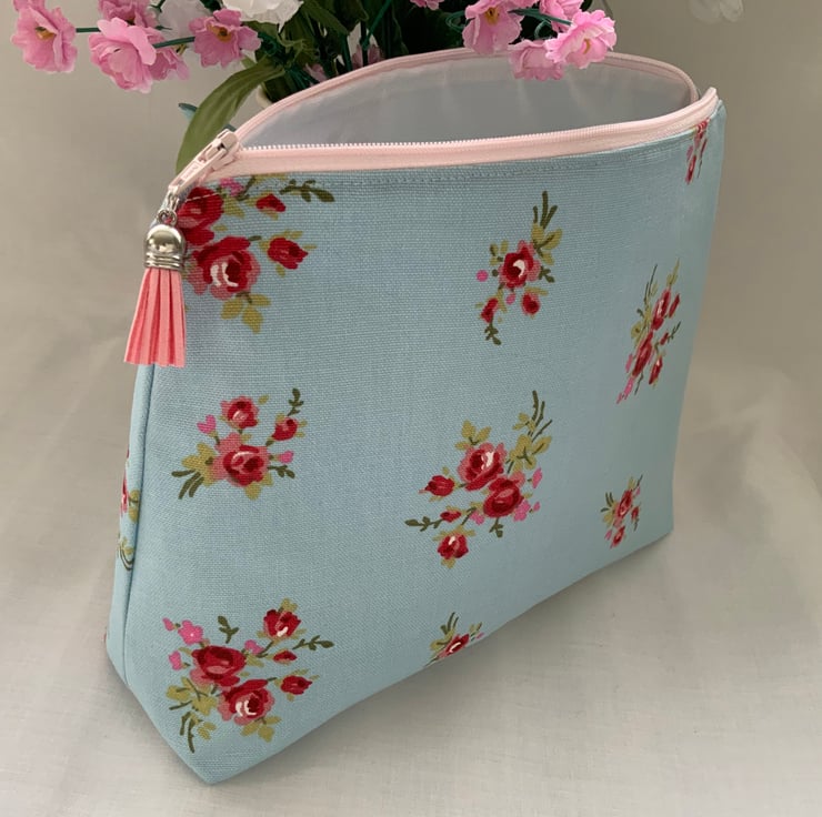 A gorgeous wash bag perfect for storing your toiletries or cosmetics. It would look stylish on display in a bathroom or on a dressing table but also perfect as a travel accessory to carry your toiletries or cosmetics. This bag is interfaced to give it structure and is lined with a white water resistant fabric. The zip is finished with a matching tassel.