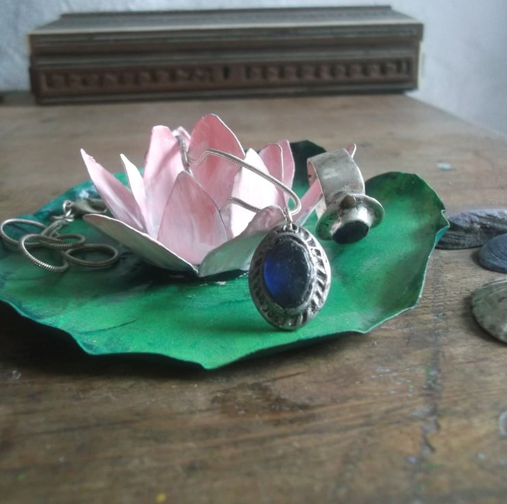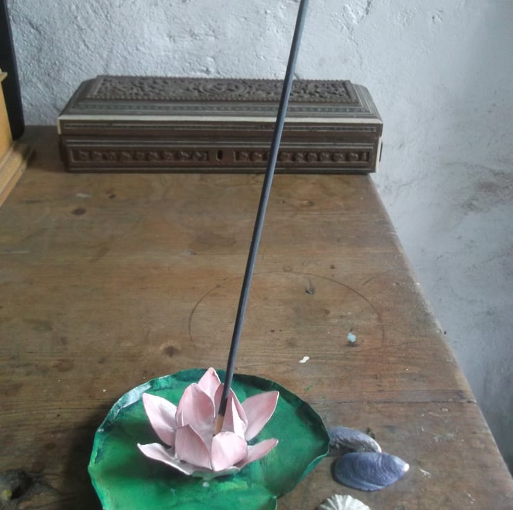 This Lotus flower and lily pad could be used as a jewellery dish or for an incense stick, theres a small hole in the flower to push the stick in.