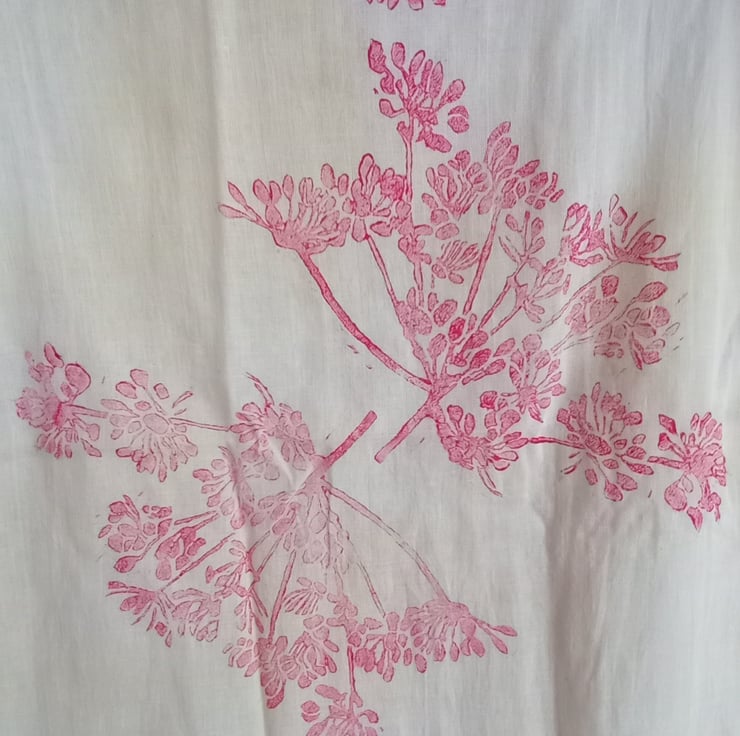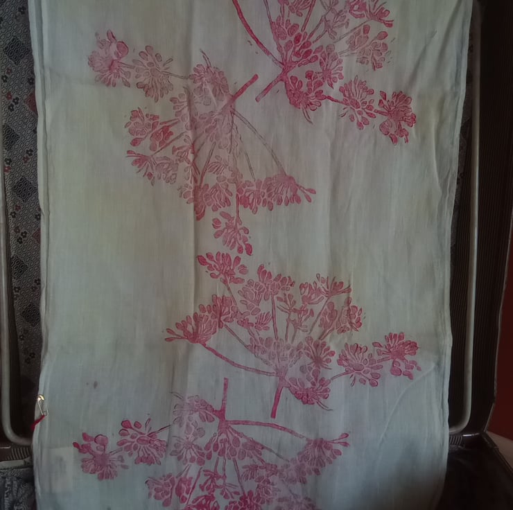 Plant dyed with Turmeric Dye, Organic Cotton Scarf with Block Printed Magenta Seed Heads Print. Tassel Detail Finish.