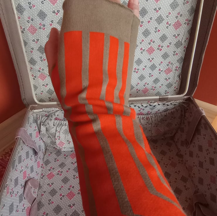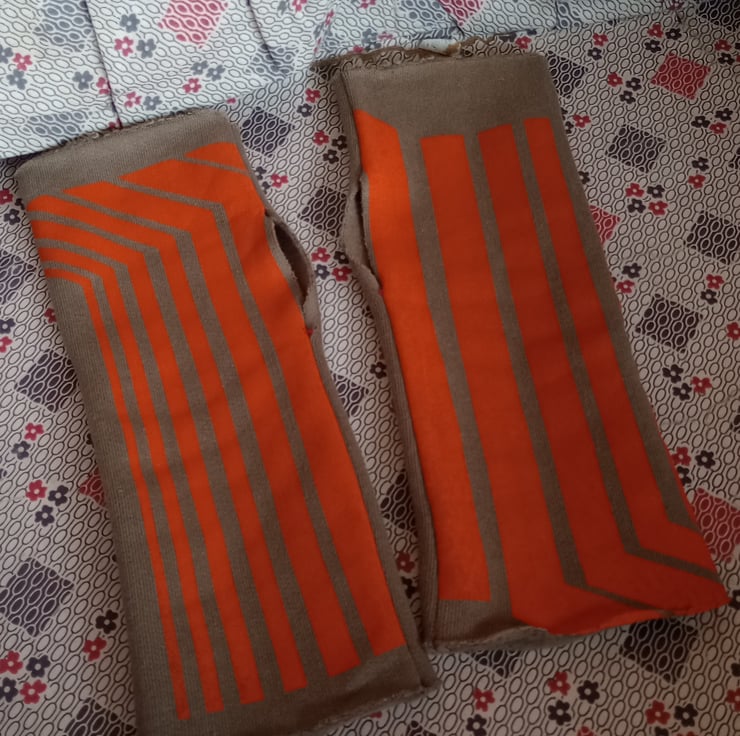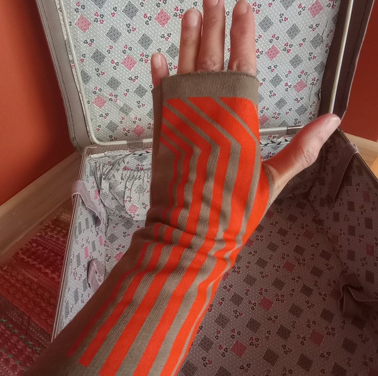 Hand Silk Screen Printed Khaki Organic Cotton Jersey Wrist Warmers.