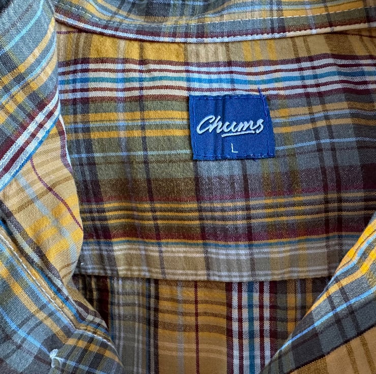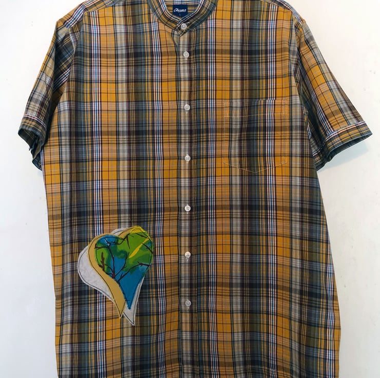 This one-of-a-kind re-created shirt brings a playful twist to slow fashion. Originally a quality short-sleeved cotton shirt by Chums (size large, regular fit), it has been transformed into wearable art with a relaxed, collarless design and quirky raw-edge appliqué.