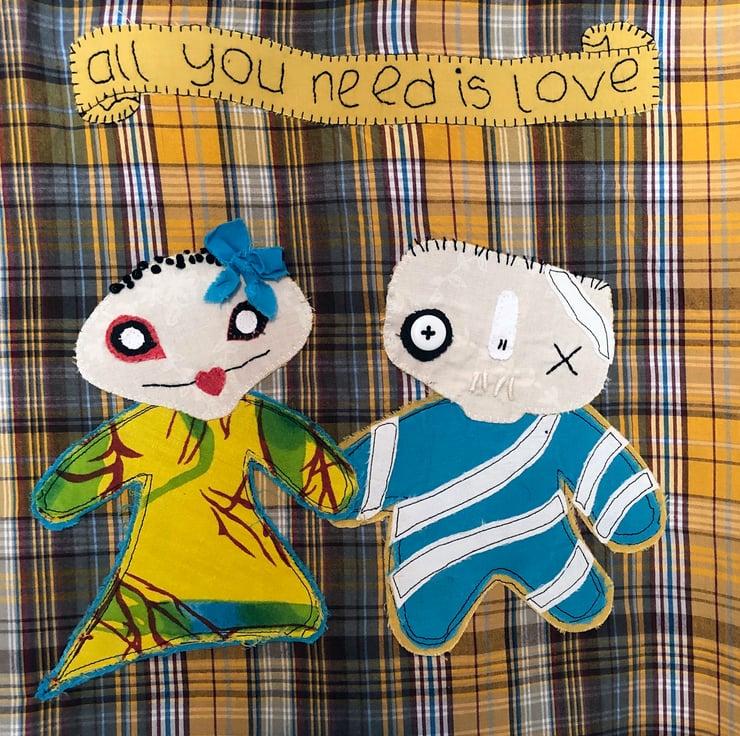 Back Design: Two whimsical zombie characters holding hands under a raw-stitched banner reading “All you need is love”—a light-hearted blend of spooky fun and warmth.