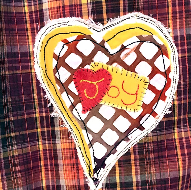 Front Design: A hand-stitched heart appliqué, layered with patterns and the uplifting word “Joy,” offers a vibrant touch of positivity.