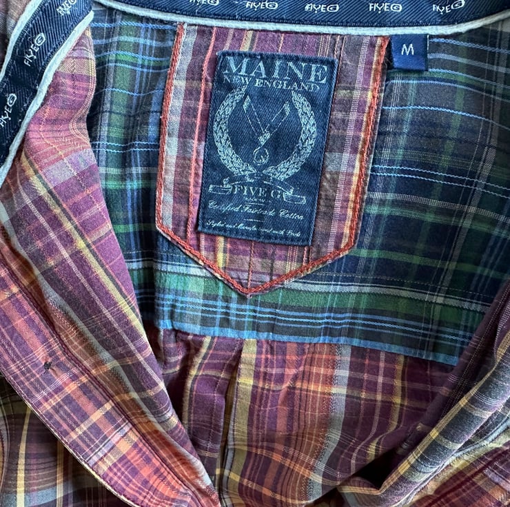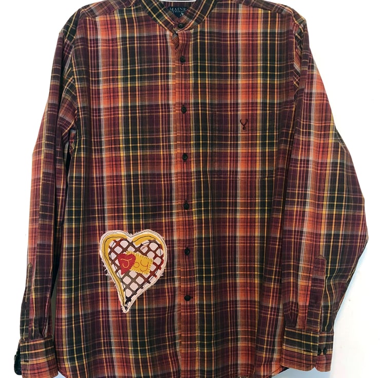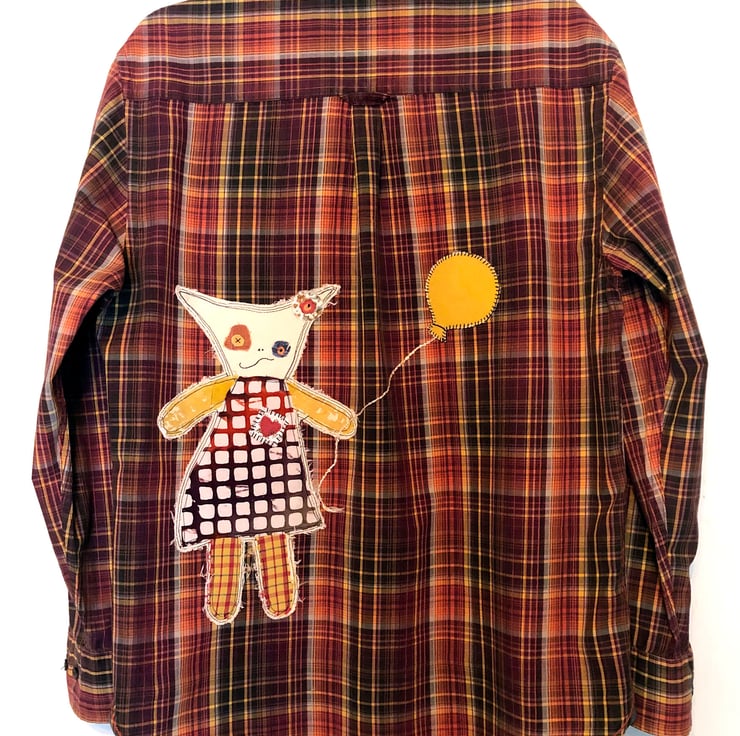This playful re-created shirt is a celebration of fun and creativity, originally a Maine New England design (size medium). With a collarless, long-sleeved silhouette and hand-stitched appliqué, it blends comfort and whimsical charm.