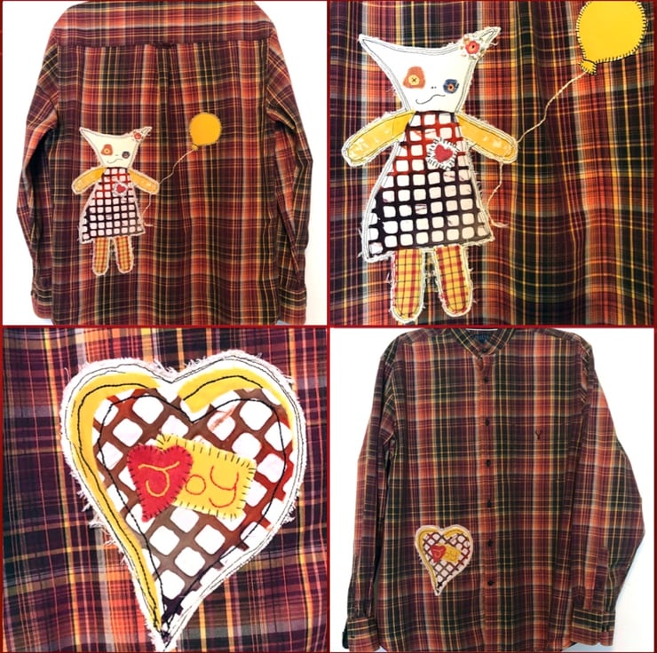 Born from a love of comfy men’s shirts and a desire to brighten them up, this collection of ‘re-created’ wearable art transforms everyday clothing into playful, artistic pieces.