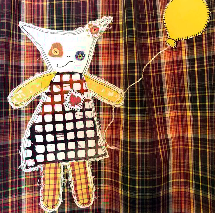 Back Design: A quirky cat/rabbit character holding a bright yellow balloon floats across the shirt, bringing joy and movement to the warm plaid backdrop.