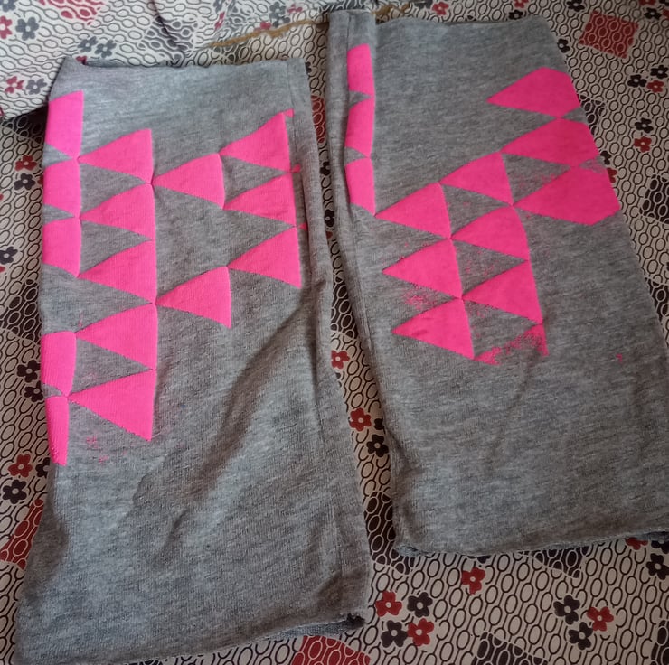 Neon Pink Assymetric Triangle Print with puff binder giving a raised puffy texture print