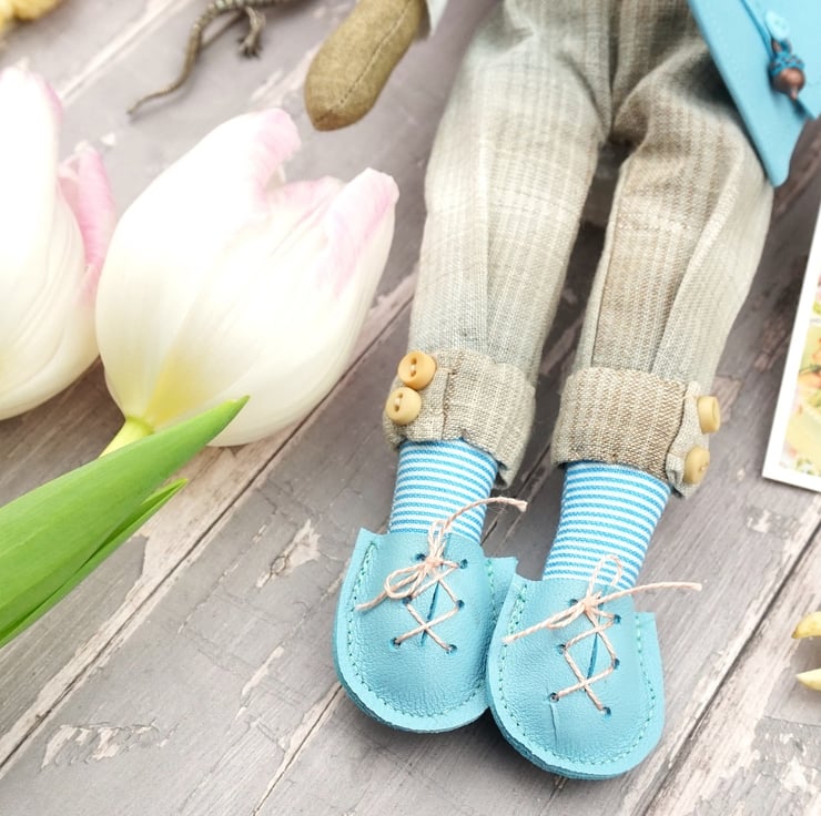 Pom is a tiny spring bunny boy dressed in a lovely Liberty Tana Lawn waistcoat, in aqua blues with orange and pink flowers running across the fabric which is called Spring Blooms. He has a coral pink silk cravat with blue and fawn tweedy plus fours in a yarn dyed fabric He has chamomile in his stuffing with a citrine crystal to his heart, hand embroidered features and a little pompom tail. He is finished with tiny buttons, a leather bag for his foraging finds and little leather shoes.