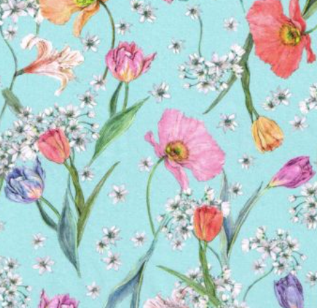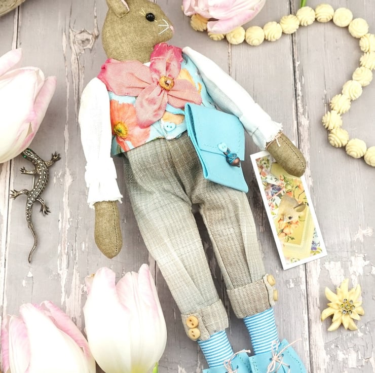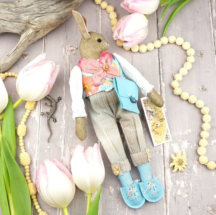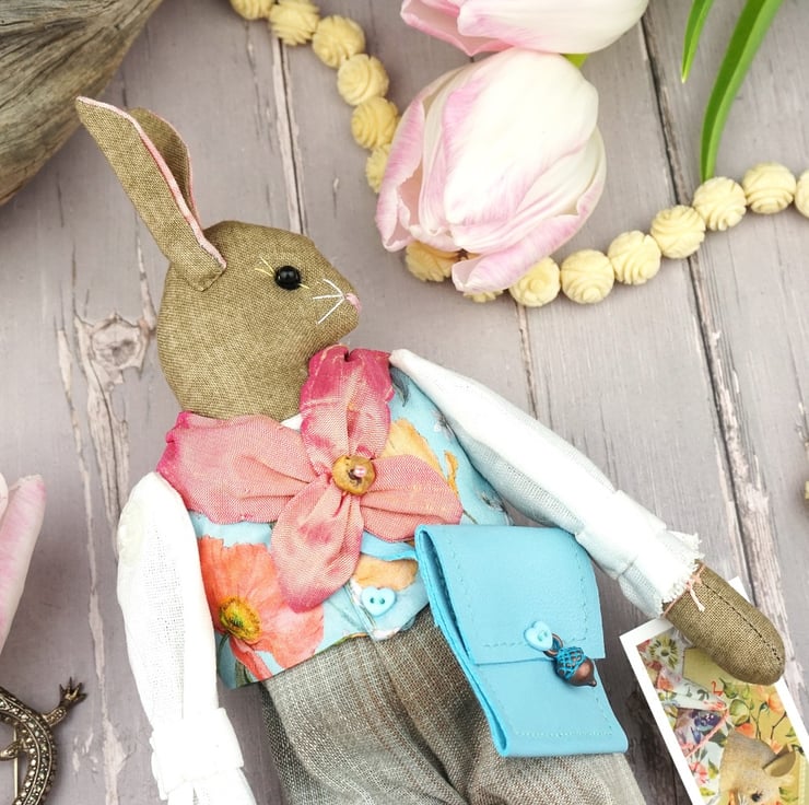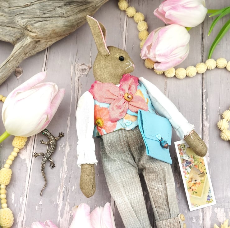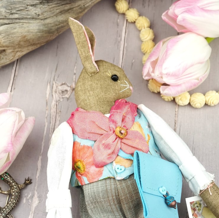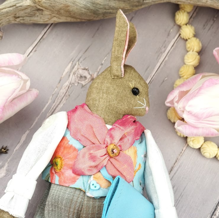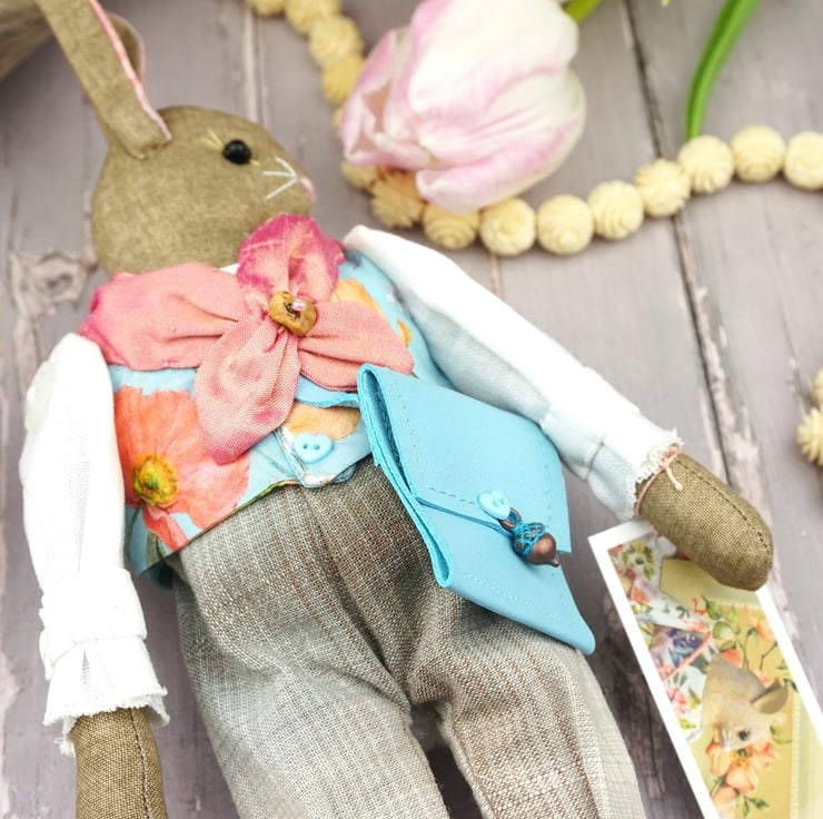 This little spring bunny is dressed in such a lovely Liberty print with a aqua blue ground with welsh poppies and tulip wildflowers flowing over his waistcoat, teamed with white linen shirt and tawny yarn dyed plus fours..