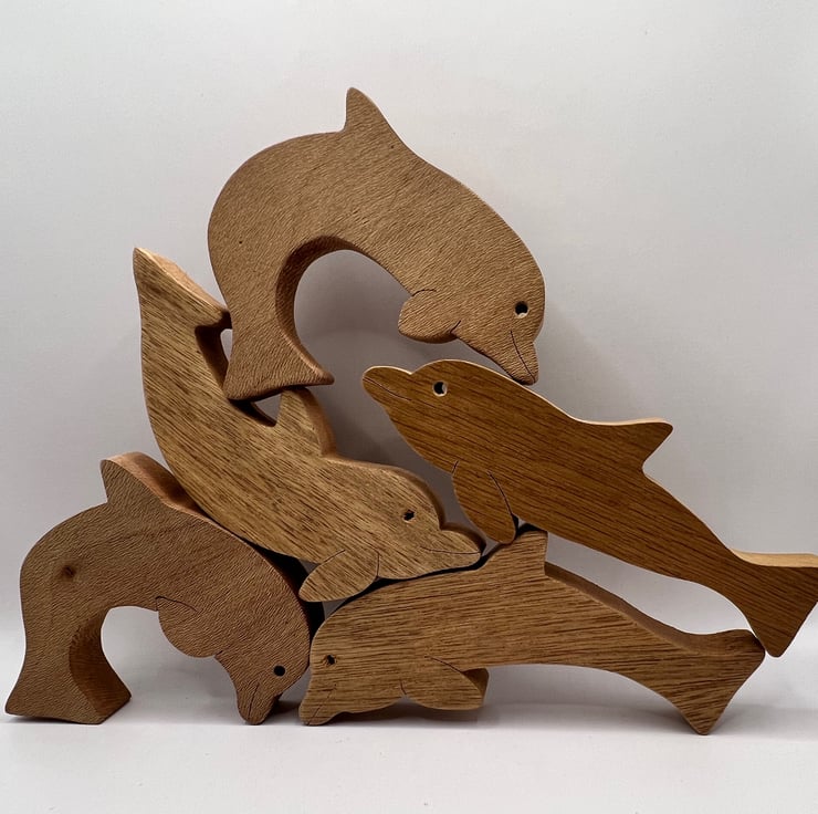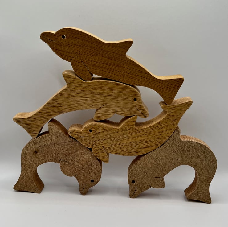 Introduce a touch of nature and creativity with this beautifully handcrafted Wooden Stacking Dolphin Set. Each of the five dolphins is uniquely shaped and made from assorted hardwoods, showcasing the natural beauty of the wood's grain and colour.