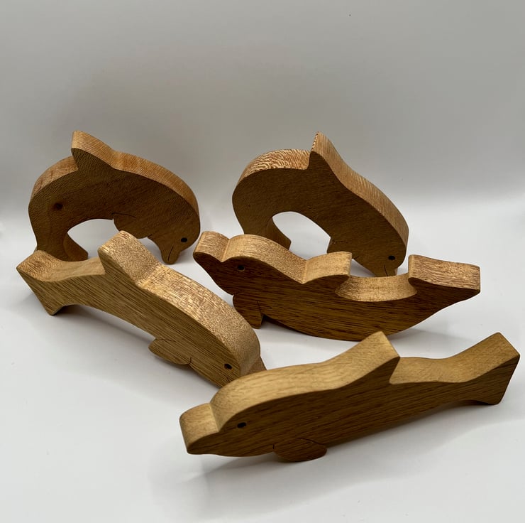 Five Unique Dolphins each with a distinct shape and crafted from assorted hardwood.