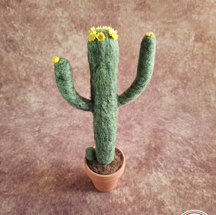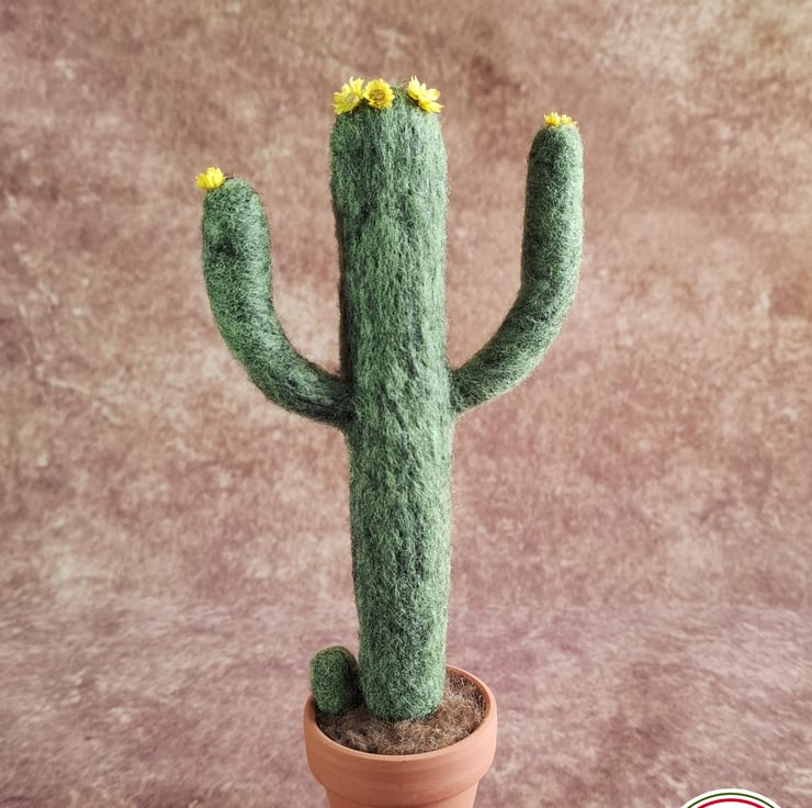 I needle felted this cactus using natural wool fibres and the pot is a real terracotta plant pot. There is also a young cactus peeking out the "soil". The tall Saguaro is in flower and is wearing a crown of yellow blooms, which are real, tiny dried flowers which have been dyed. There are smaller flowers on the tips of its “arms”.