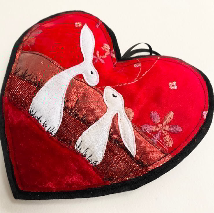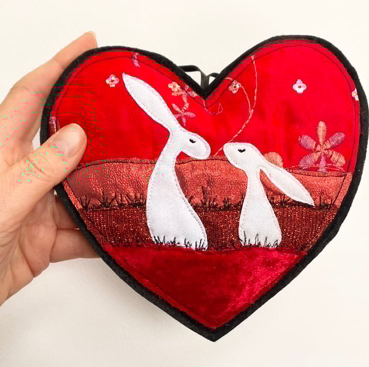 This sweet embroidered hare home decoration shows 2 adorable hares gazing at each other set against a red landscape. It has been made from up-cycled fabrics and stitched down with free motion embroidery. Each heart varies slightly. It comes felt backed and measure approx 17 x 15.5cm, with the ribbon length 24cm.