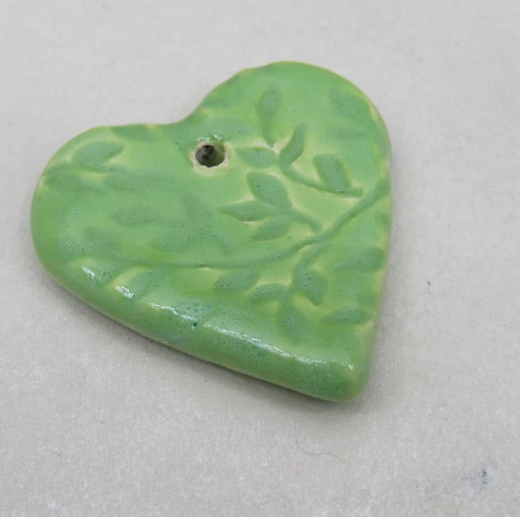 Medium heart shaped stoneware pendant, textured with a delicate leaf motif.