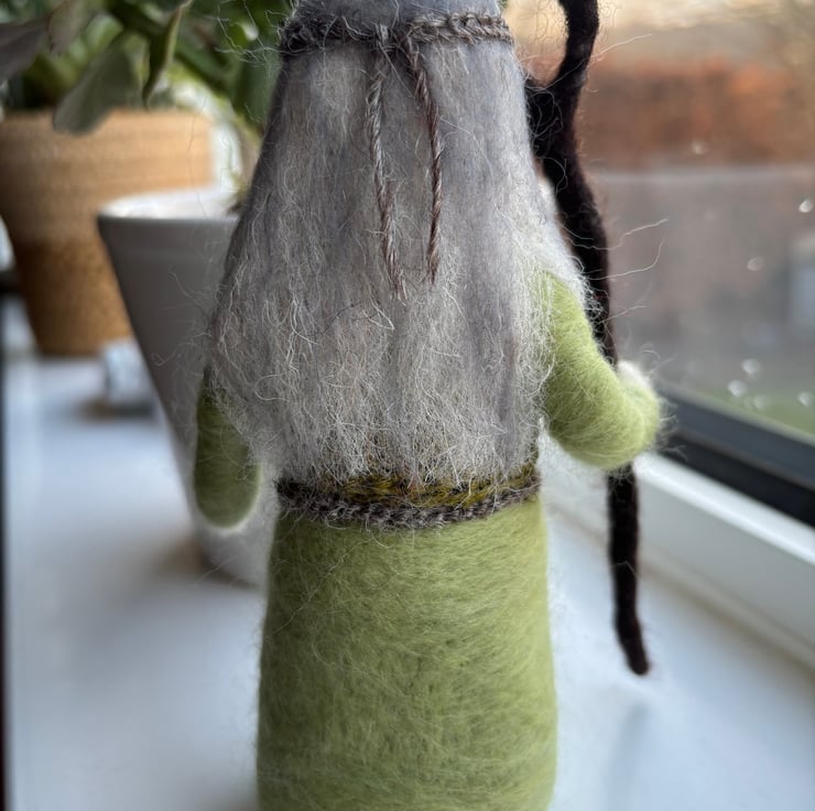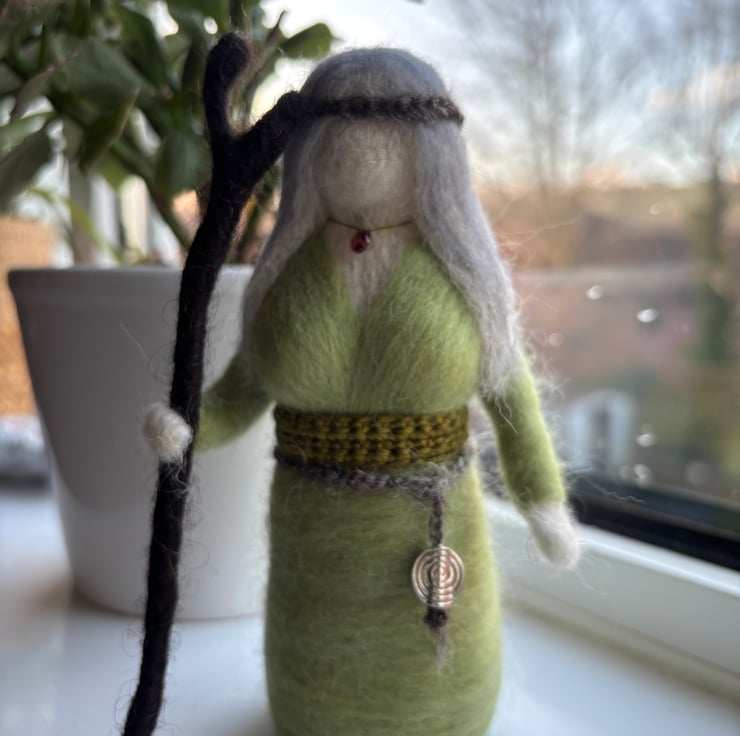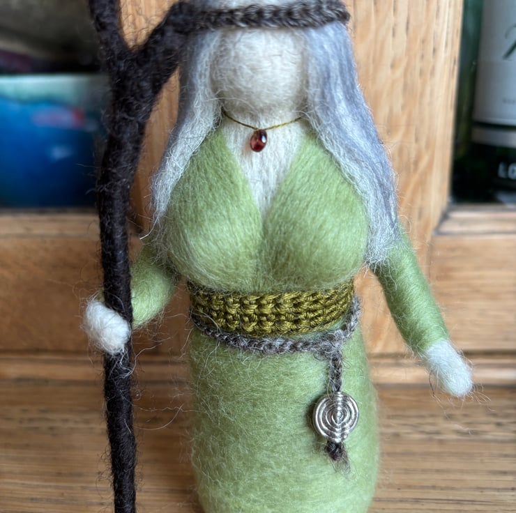 14cm tall. Needle felted body and hair using merino and jacobs wool. Head band and charm-belt crocheted with hand-spun Jacob’s wool. Belt crocheted with embroidery silk. Necklace made from genuine garnet and silk thread. Staff made with Jacob’s fleece around a pipe cleaner core.