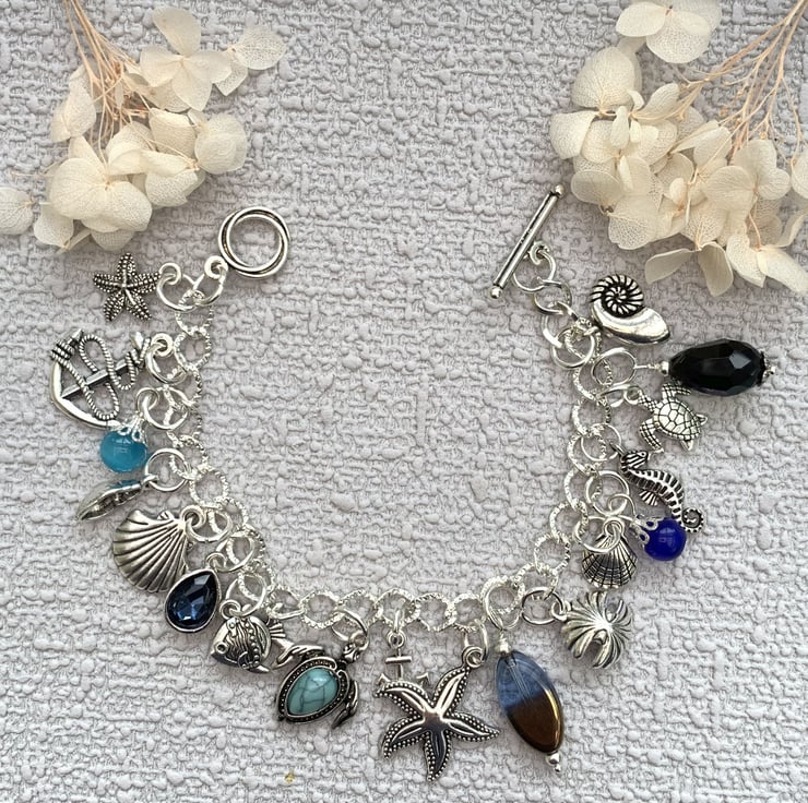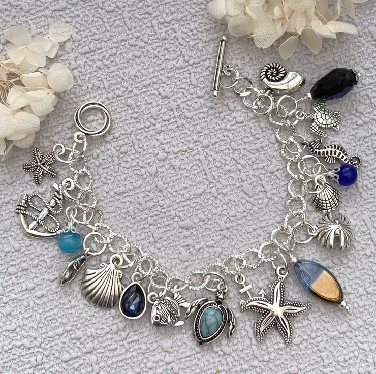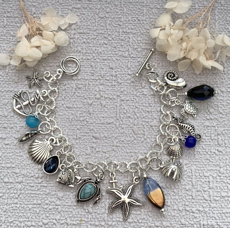 This pretty charm bracelet is made in a marine theme with a collection of fish, shell and marine creature charms combined with different blue glass drop charms. The bracelet is finished with a toggle fastening and is 19cm in total length.