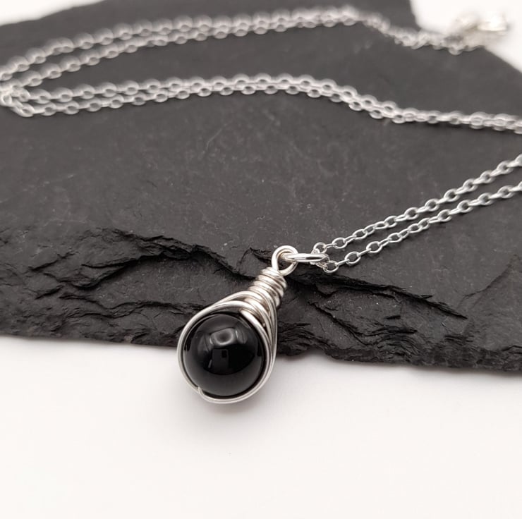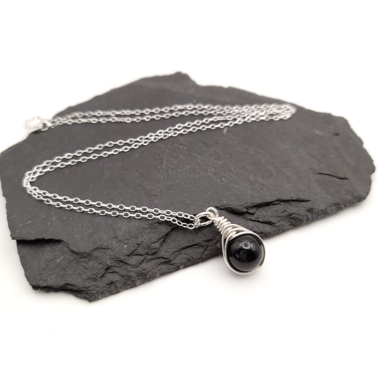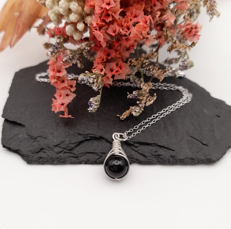 Lovely dainty Black Tourmaline pendant which has been wire wrapped in a delicate celtic knotwork style. Comes with a sterling silver chain. Tourmaline is a lovely glossy black stone and very popular in crystal healing. It is also the modern birthstone for October