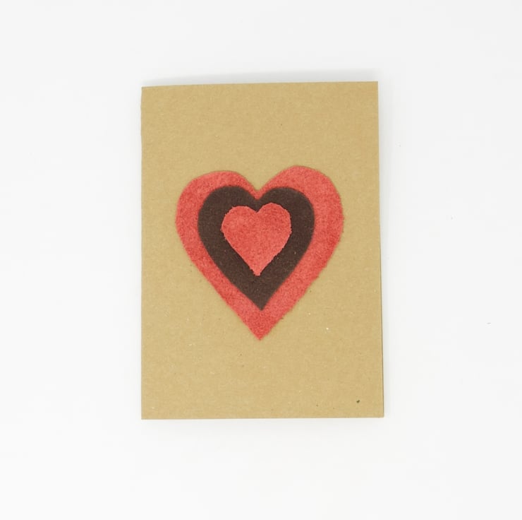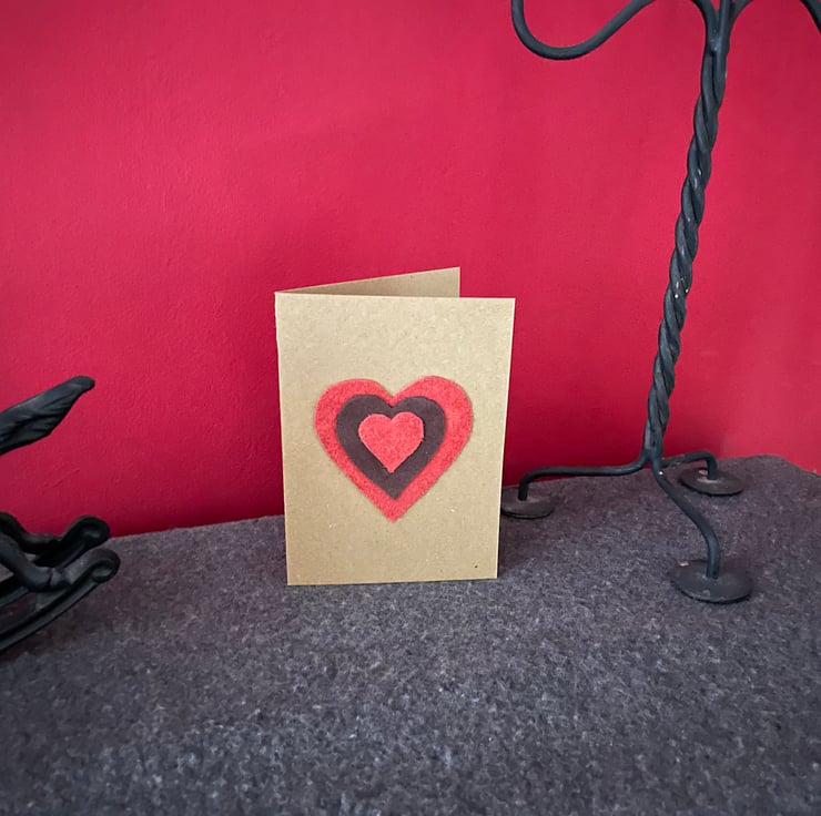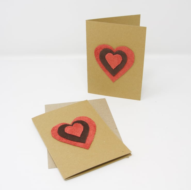 This simple Valentine's card is made from 3 overlapping hearts in red and brown suede leather. Each heart has been hand-cut making this a thoughtfully unique card for someone special.
