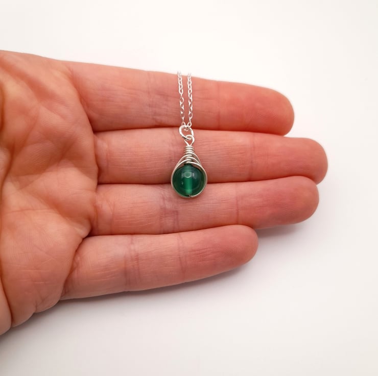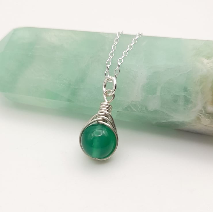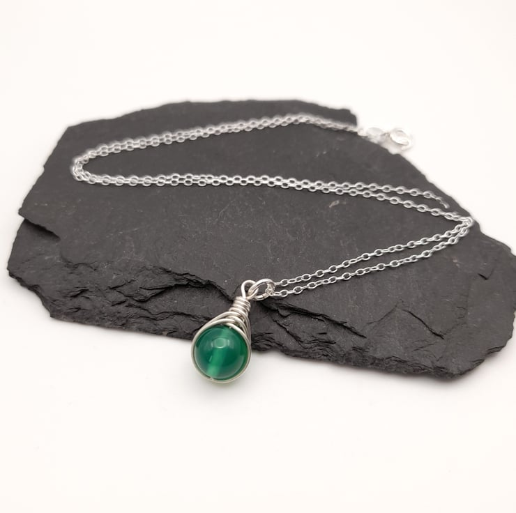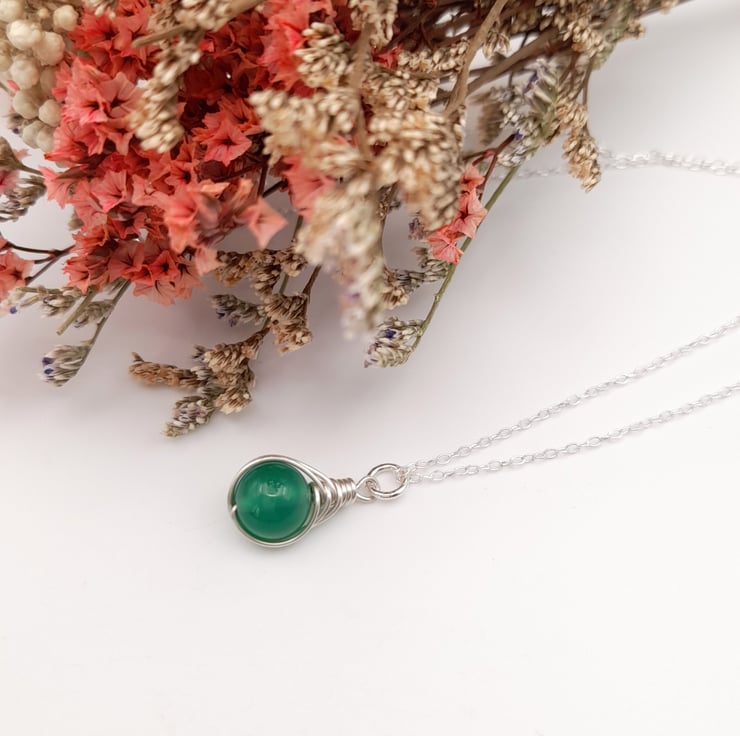 A pretty sterling silver pendant with silver wire delicately wrapped around a green onyx gemstone. This style is known as a celtic herringbone design. Green onyx is the modern birthstone for May and is a lovely deep green colour.