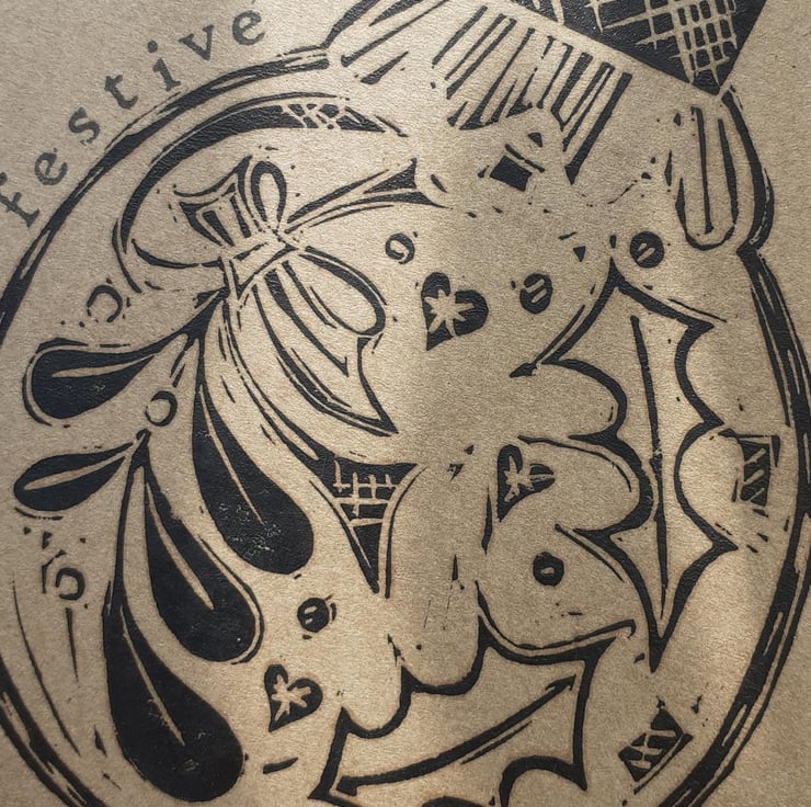 The kraft paper front cover features a print of my original bauble design with the stamped words 'festive jottings' and my ‘Mandy Benton Printmaker’ logo on the reverse.