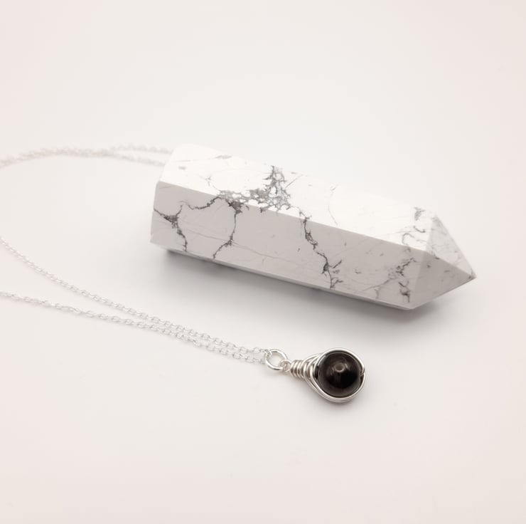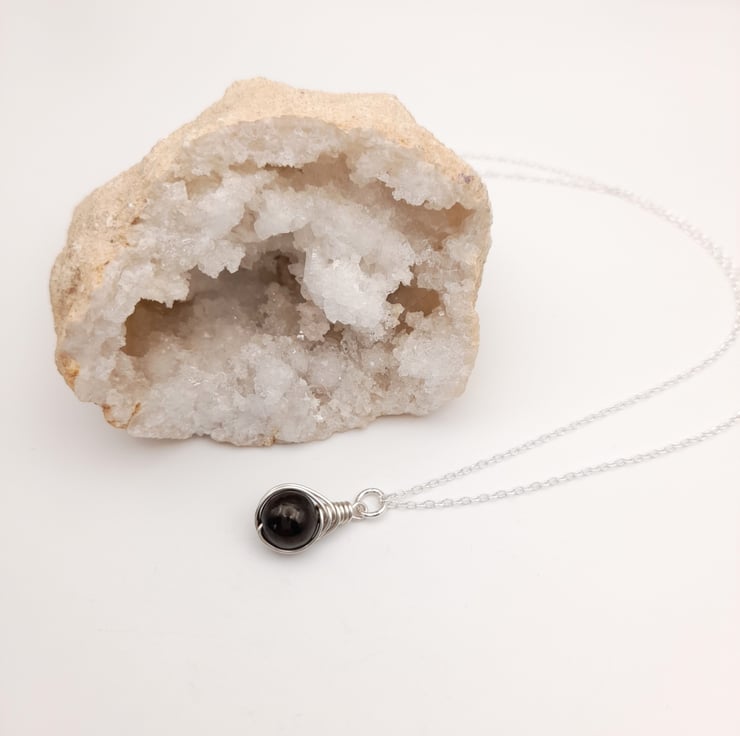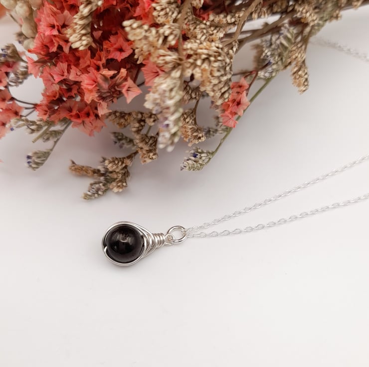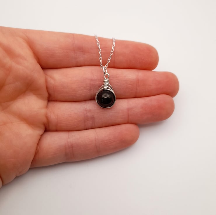 Dainty pendant necklace with a genuine Jet gemstone which has been wire wrapped in a delicate celtic knotwork design.