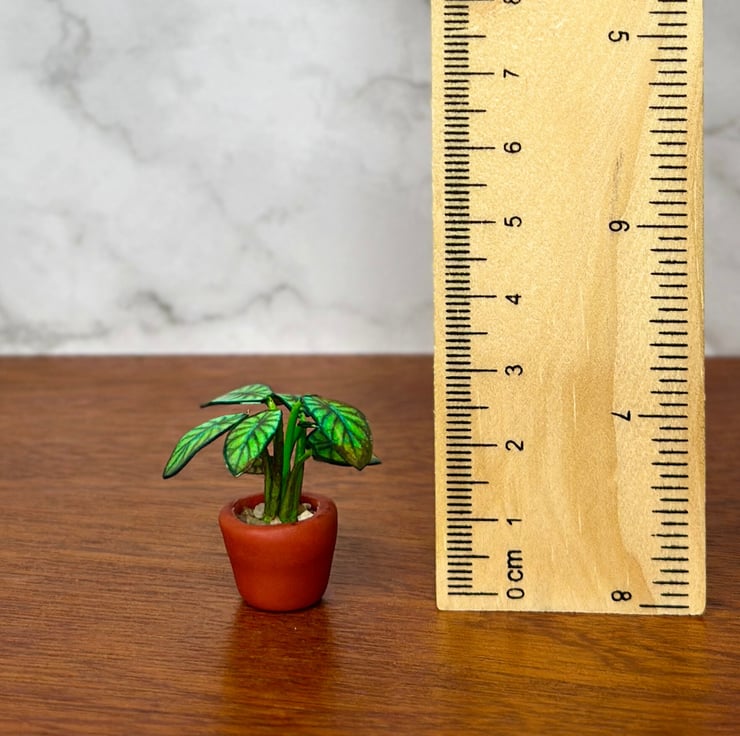 Each leaf is hand-cut, shaped, and painted to mimic the rich green tones and detailed ridges of a real Dragon Scale plant. Placed in a handmade terracotta or clay pot, this 1:12 scale miniature plant adds a touch of fantasy and elegance to any tiny space—forever enchanting, with no care needed!
