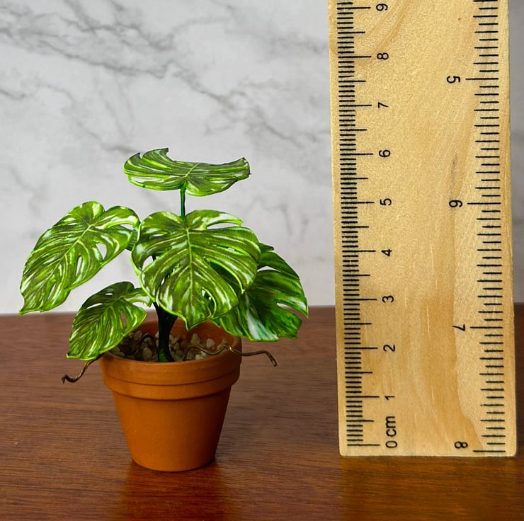 Each leaf is hand-cut, shaped, and painted to mimic the plant’s natural variegation and delicate splits. Placed in a handmade terracotta or clay pot, this 1:12 scale miniature Monstera brings a touch of nature’s rare beauty to any tiny space—no watering needed, just pure botanical charm!