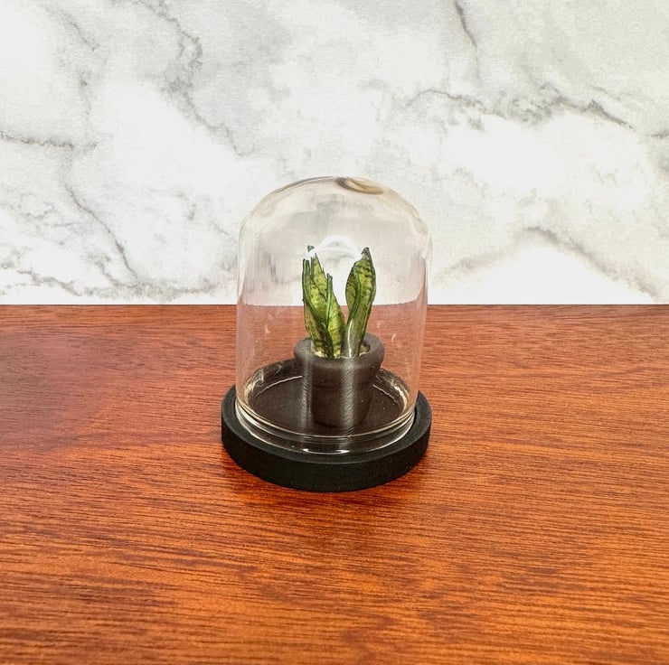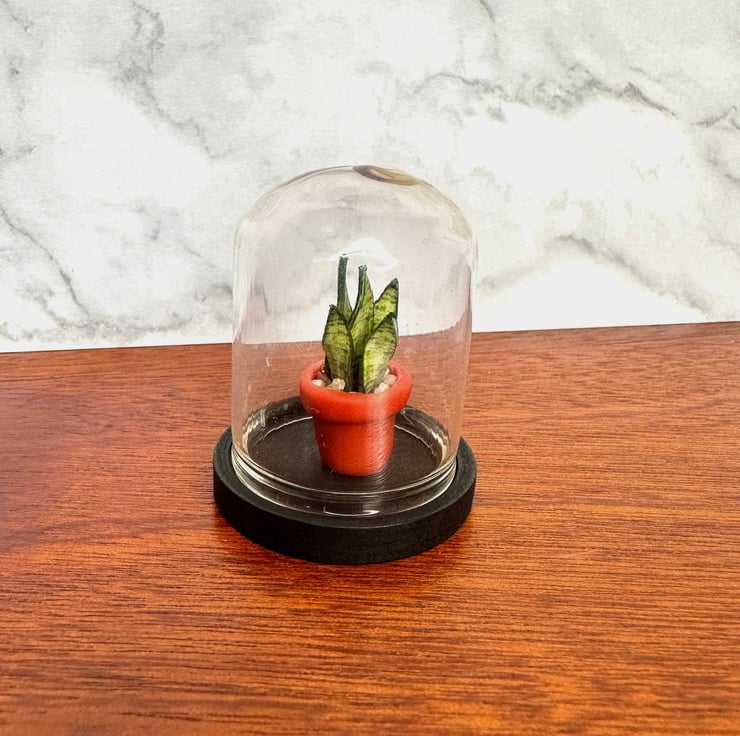 Each leaf is hand-cut, shaped, and painted to replicate the realistic textures and colors of a full-sized snake plant. Encased in a glass dome, this 1:12 scale miniature plant brings a sophisticated and natural touch to any tiny space—forever fresh and maintenance-free!