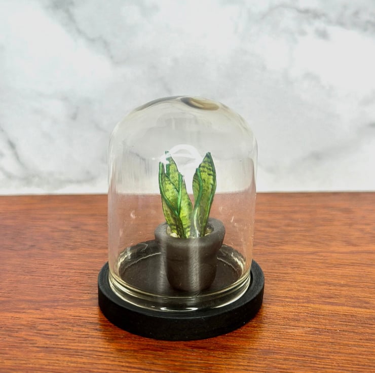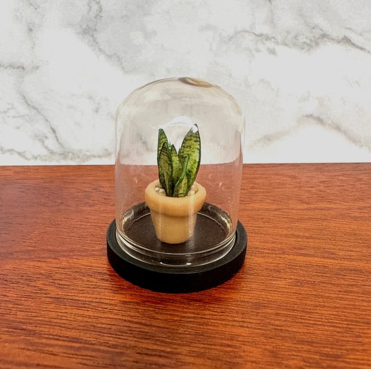The snake plant, with its tall, structured leaves and striking variegation, has long been a symbol of strength, resilience, and timeless beauty. Known for its ability to thrive in any environment, it inspired me to create a miniature version that captures its charm in a delicate glass bell jar—a tiny botanical display perfect for dollhouses, dioramas, and collectors.