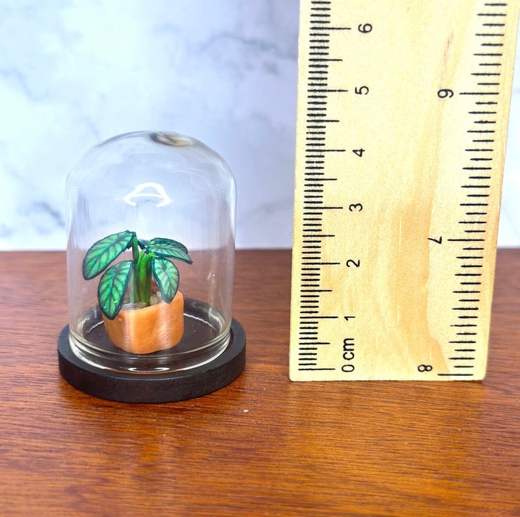 Each leaf is hand-cut, shaped, and painted with fine detailing to mimic the plant’s natural texture. Encased in a glass dome, this 1:12 scale miniature Dragon Scale plant adds a magical and realistic touch to any tiny setting.