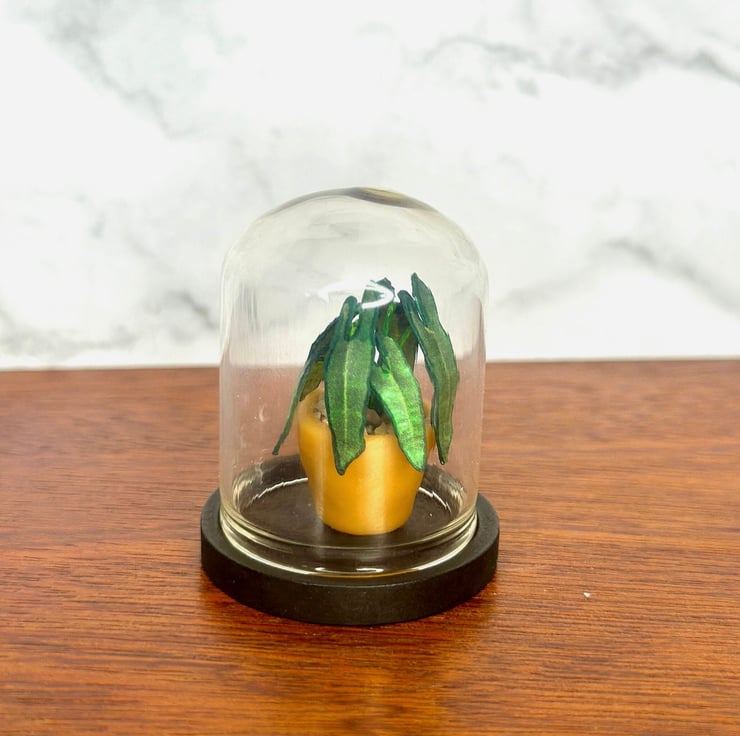 The glass cloche adds a touch of sophistication, enhancing the beauty of the miniature plant inside. Ideal for plant lovers, birthdays, housewarming gifts, or just because.Every detail, from the realistic leaves to the charming glass dome, is crafted with precision and care.