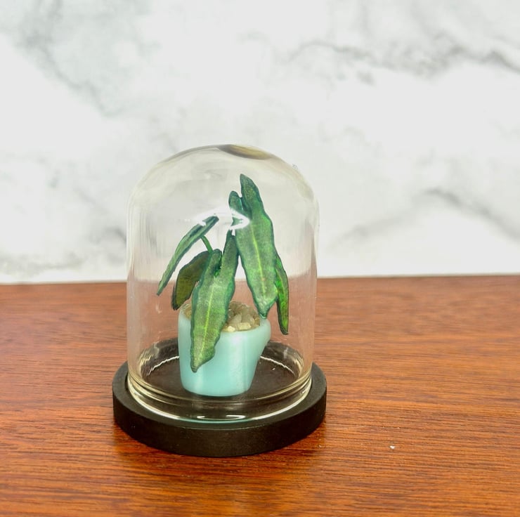 Each leaf is hand-cut, shaped, and painted with fine details to replicate the plant’s natural patterns. Encased in a glass dome, this 1:12 scale miniature Alocasia brings a sophisticated and lifelike touch to any miniature setting.