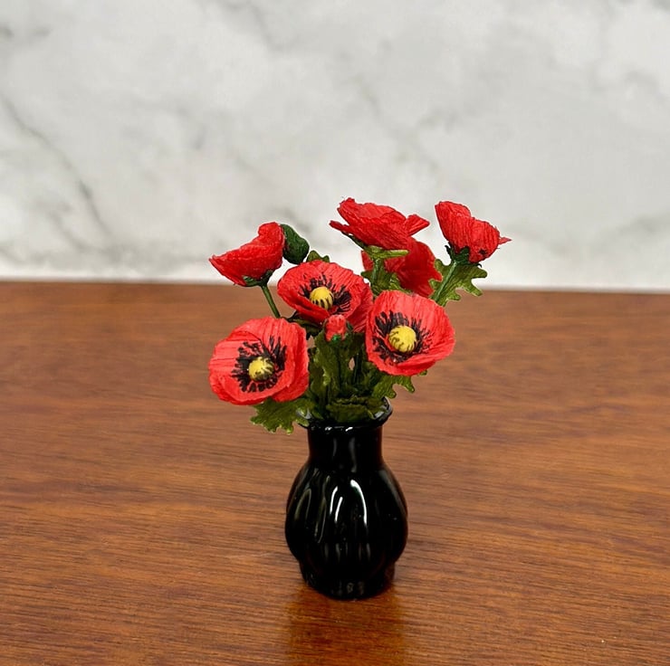 "Poppy flowers have always fascinated me with their delicate petals and vibrant colors. They symbolize remembrance, peace, and resilience—qualities that make them special in both nature and art. I wanted to capture their beauty in a way that lasts forever, which led me to create these handmade 1:12 scale miniature poppy flowers."