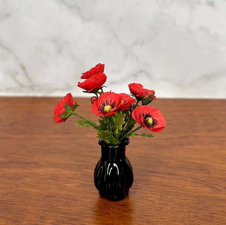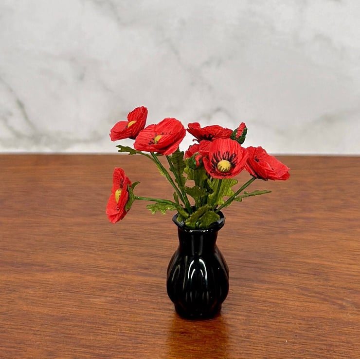 Add a touch of elegance to your home decor or dollhouse with this exquisite handmade miniature paper poppy flower in a dark glass vase. Each poppy flower is carefully crafted by hand, ensuring that every piece is unique.