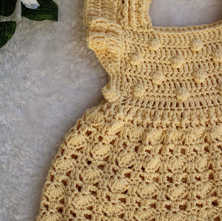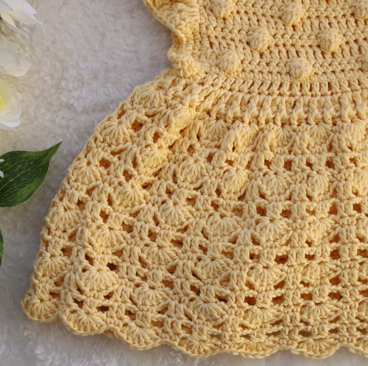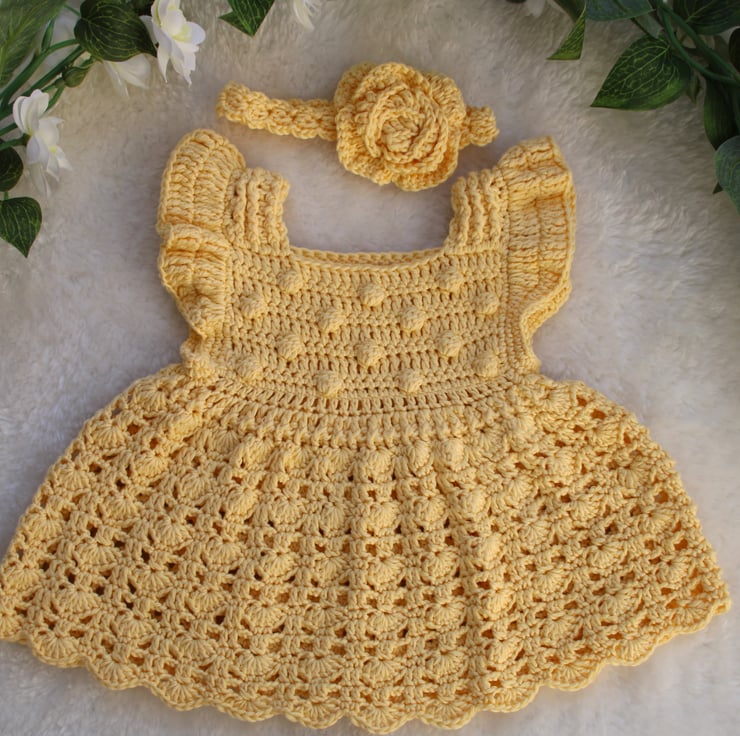 Made using a bamboo/cotton yarn that makes this dress soft, cool and comfortable to wear against a new baby's skin. A pale yellow colour gives this dress a timeless look.