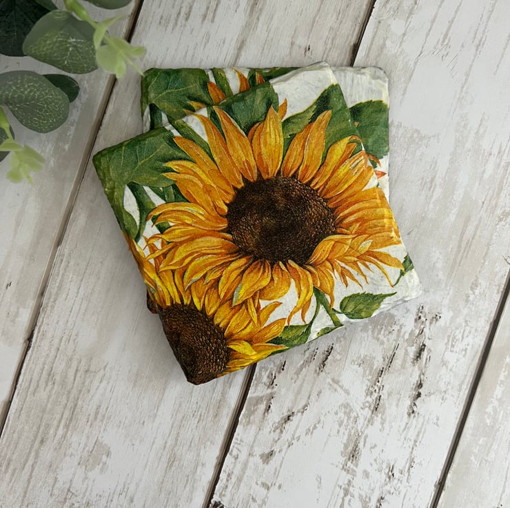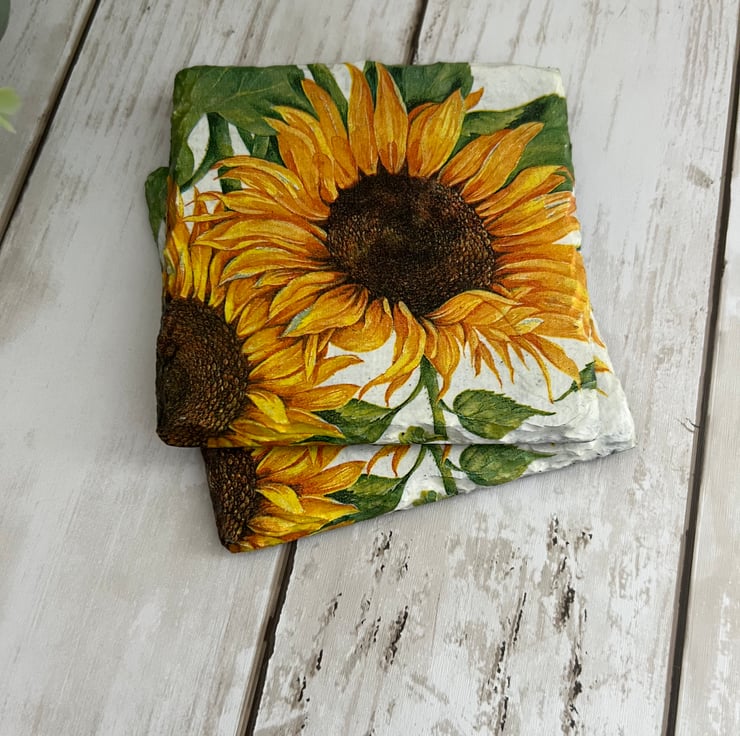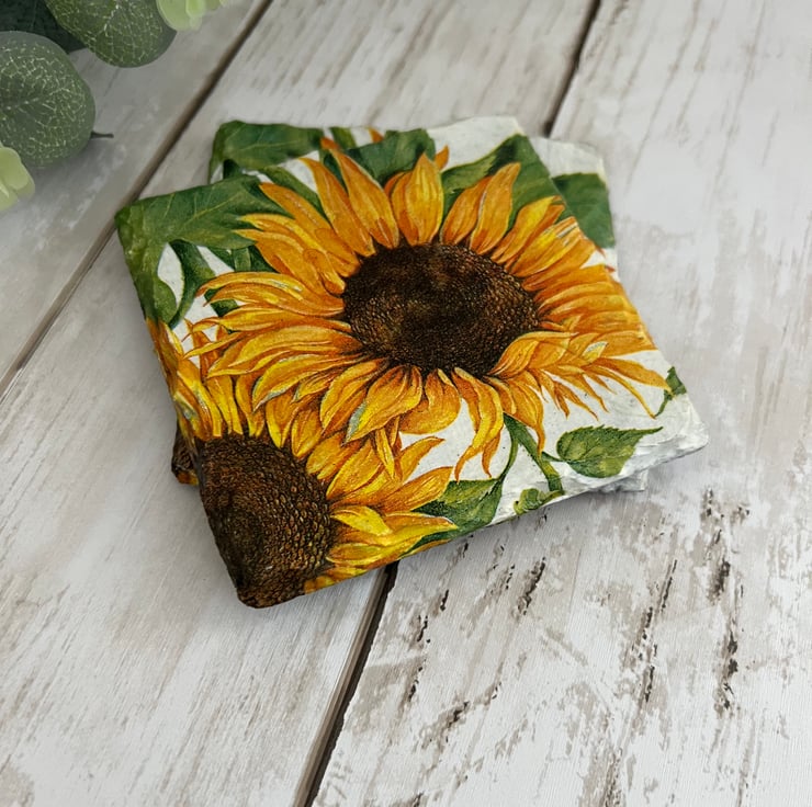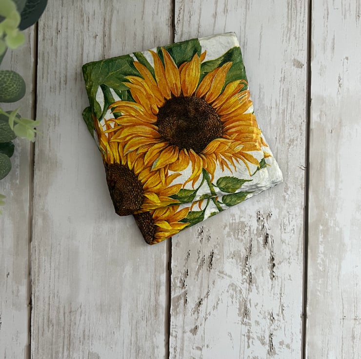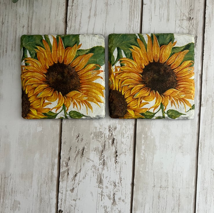 Slate Coaster Set of 2: Decoupage Sunflowers- Home Decor, Dining, Gifts, Kitchen