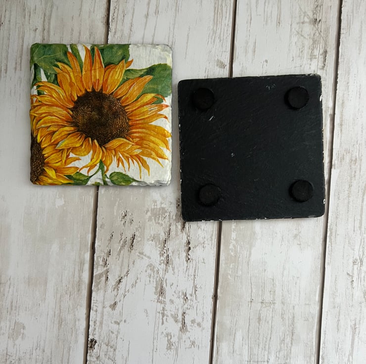 The slate coasters have been decoupaged with a pretty sunflowers design and finished with many coats of heat and water resistant varnish for protection. The reverse of each coaster has been left in its natural form.