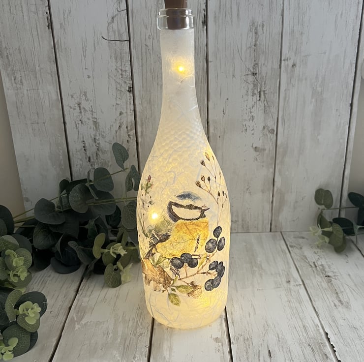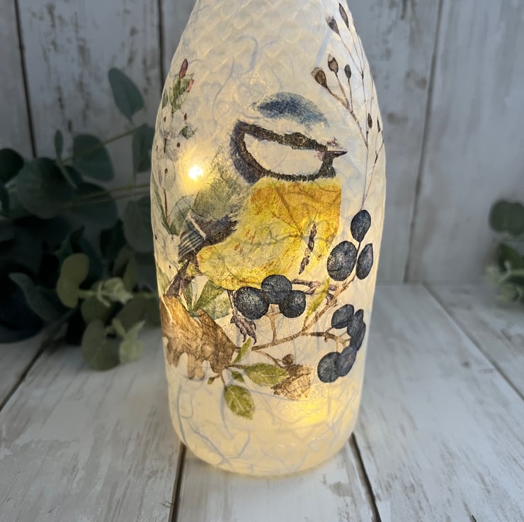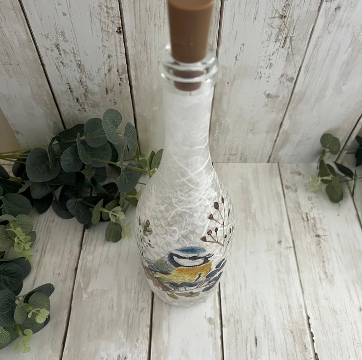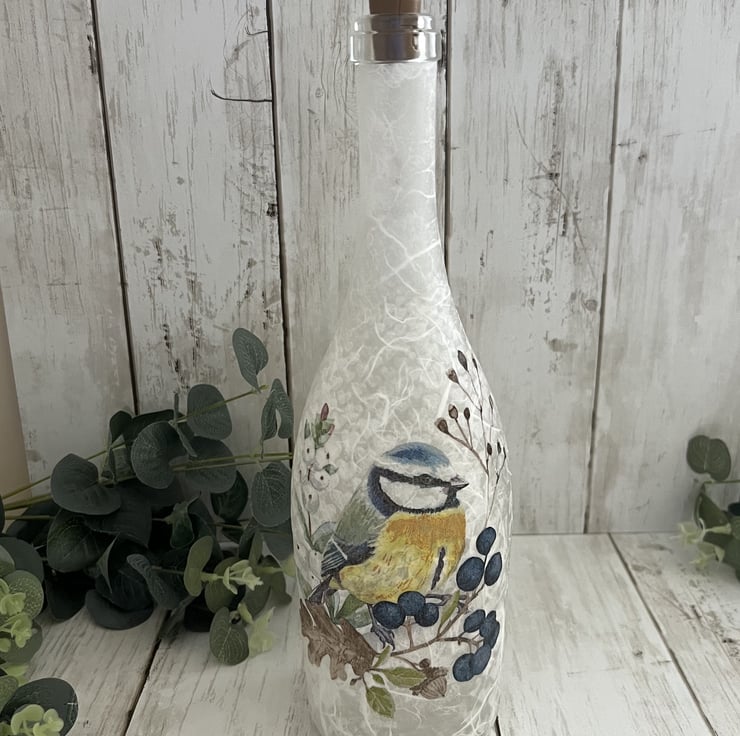 Decoupage Upcycled Glass Bottle Light - Blue Tit, Home Decor, Nature Inspired