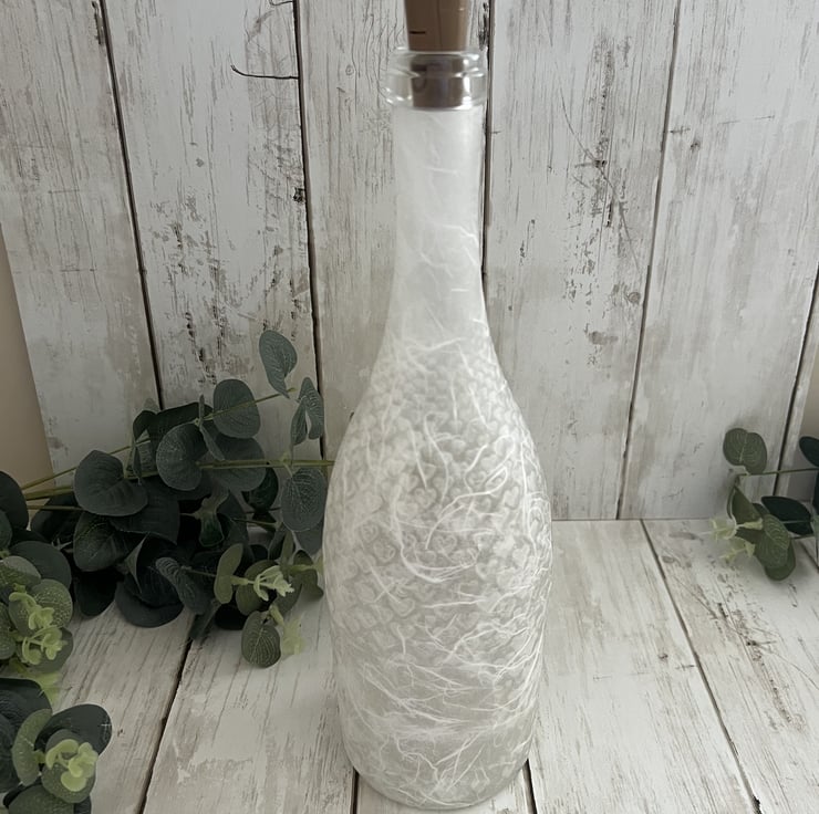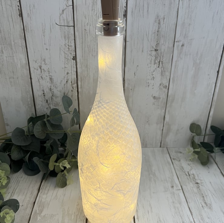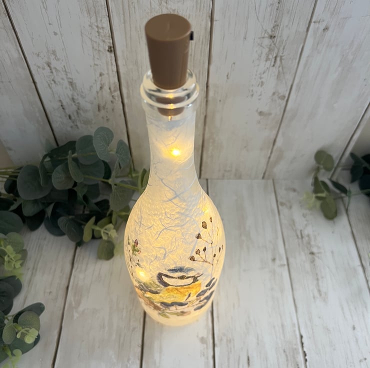 This prosecco bottle has been decorated using a textured technique and then decoupaged with a lovely blue tit and foliage design. The bottle has been finished with several coats of heat and water resistant varnish for protection. The fairy lights inside are battery operated with a switch on the cork.