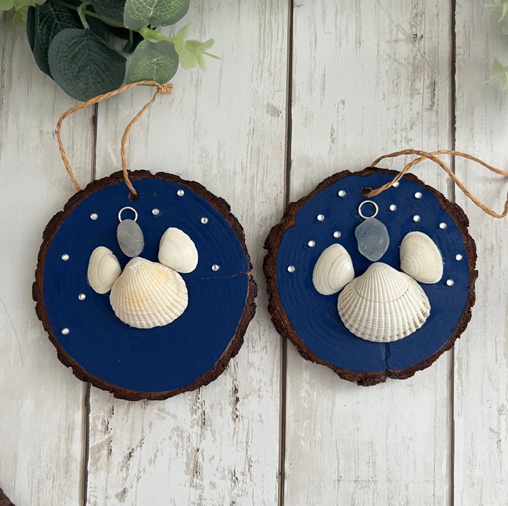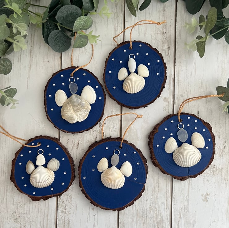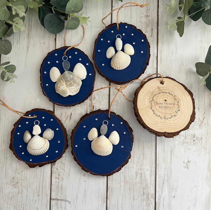 Handmade wood slice angel tree hanging decoration made with shells, sea glass and pebbles, a painted blue background and tiny gem stones.