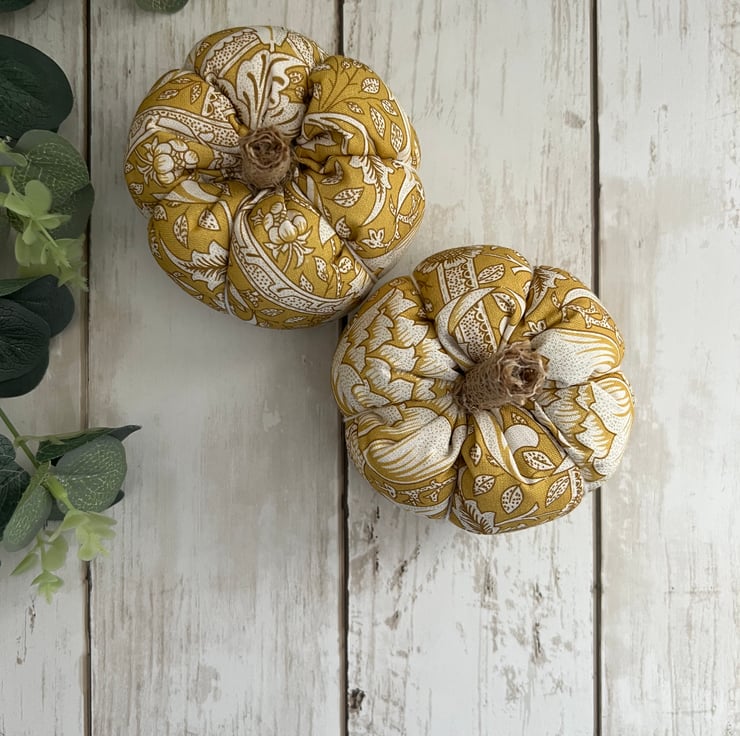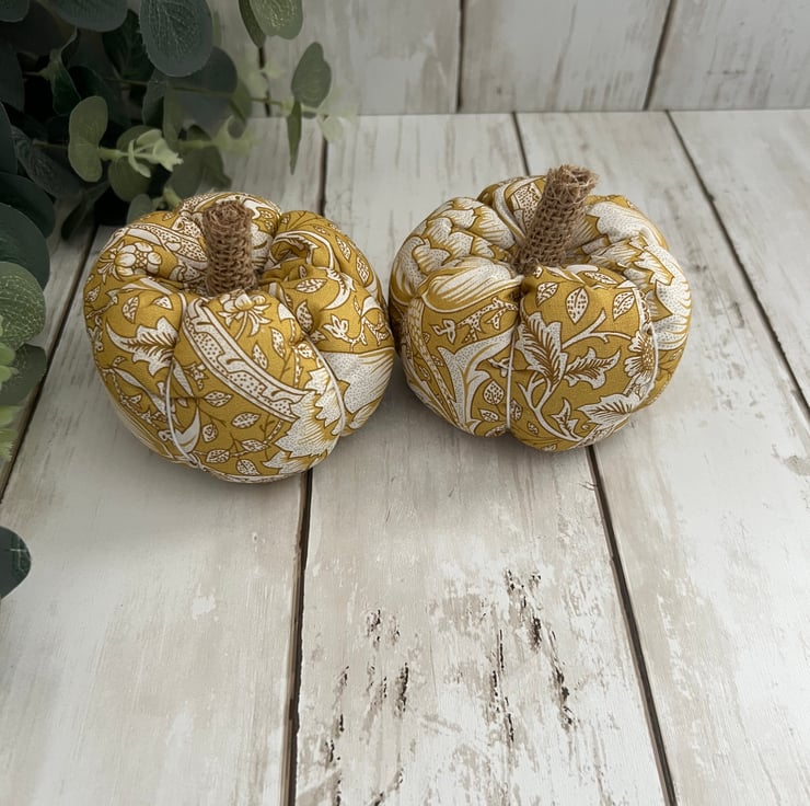 The pumpkin decorations come in a gorgeous William Morris Mustard and White pattern finished with a hessian stem.