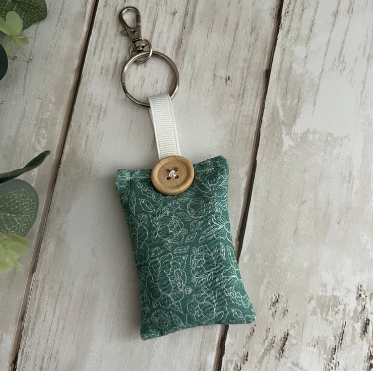 The sachet has been finished in a pretty sage green floral cotton fabric and a co-ordinating grosgrain hanging ribbon at the top and a wooden button. The metal fastening consist of a split ring and a lobster swivel clasp. Pattern placement may vary on each sachet, but I try to ensure there is a good pattern to both sides.