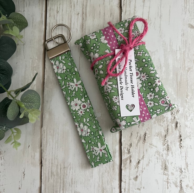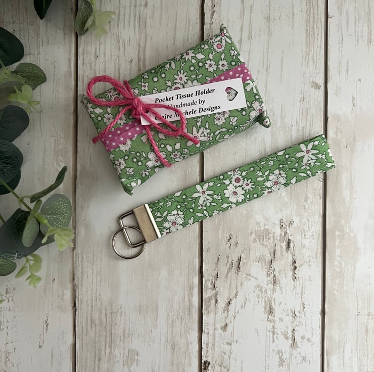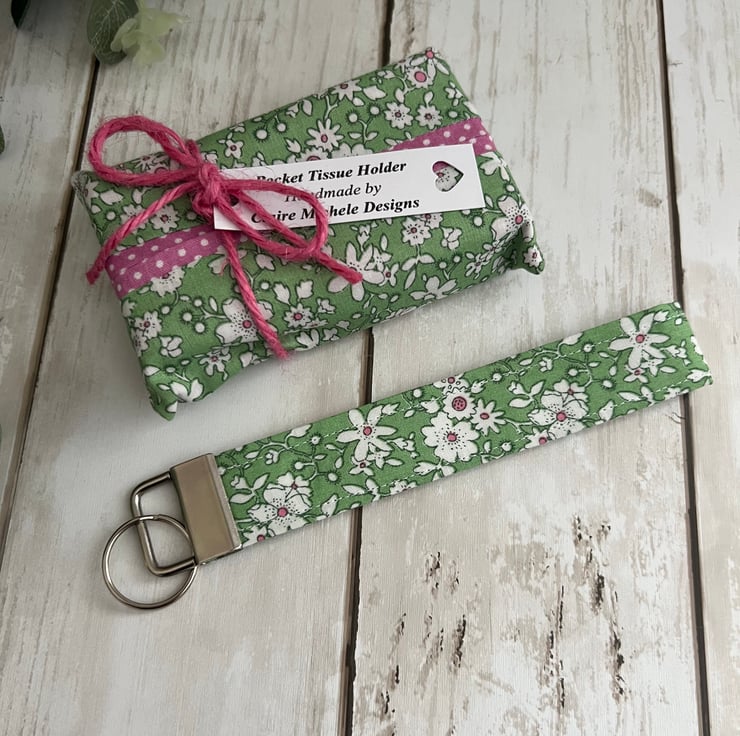 Handmade gift set comprising of a fabric pocket tissue holder and key ring.