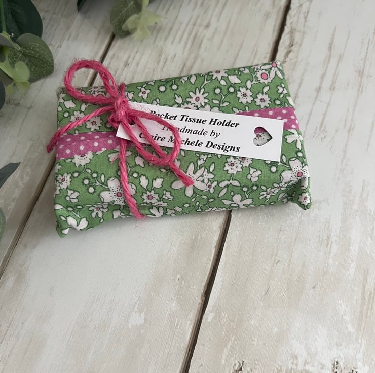 These fabric tissue holders make great gifts and are perfect for popping in your handbag whilst travelling or out and about or even to leave in the car, keeping your tissues clean and tidy. The fabric holder s made with 100% cotton fabric in green with a white floral design.