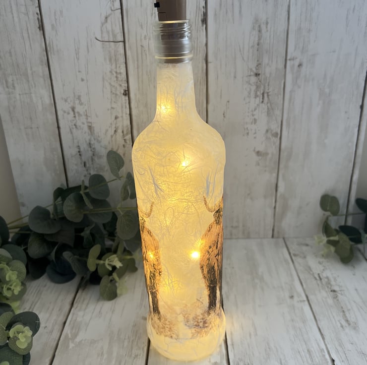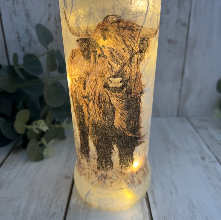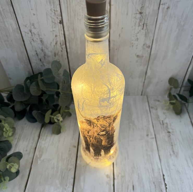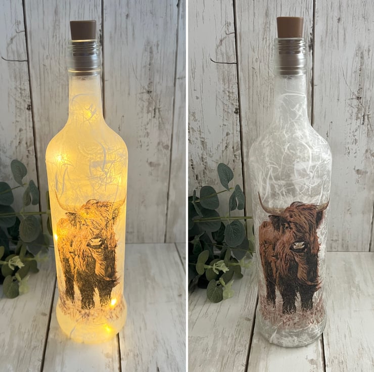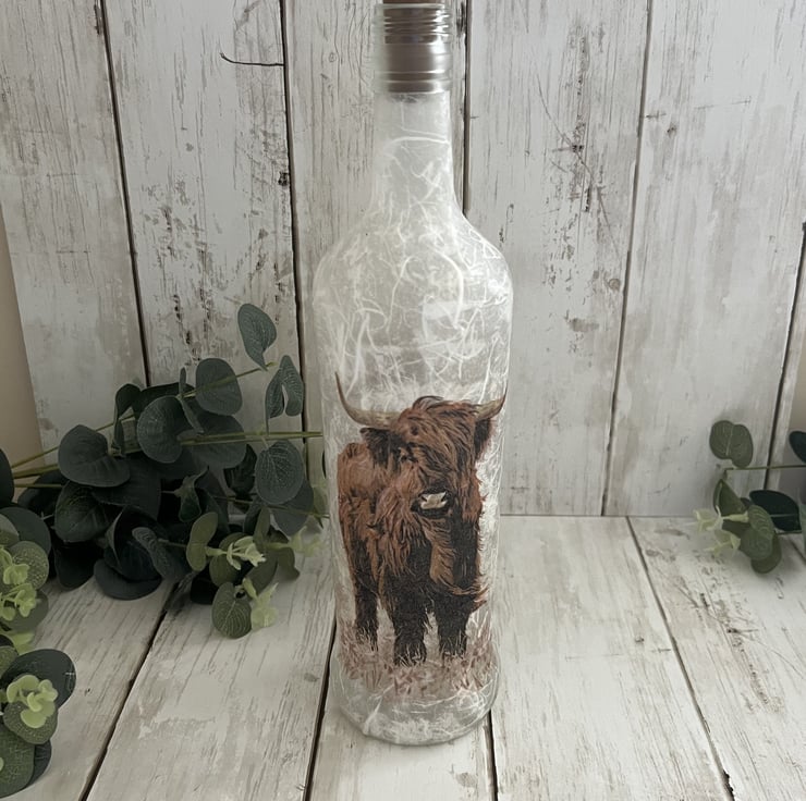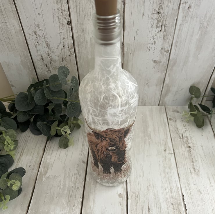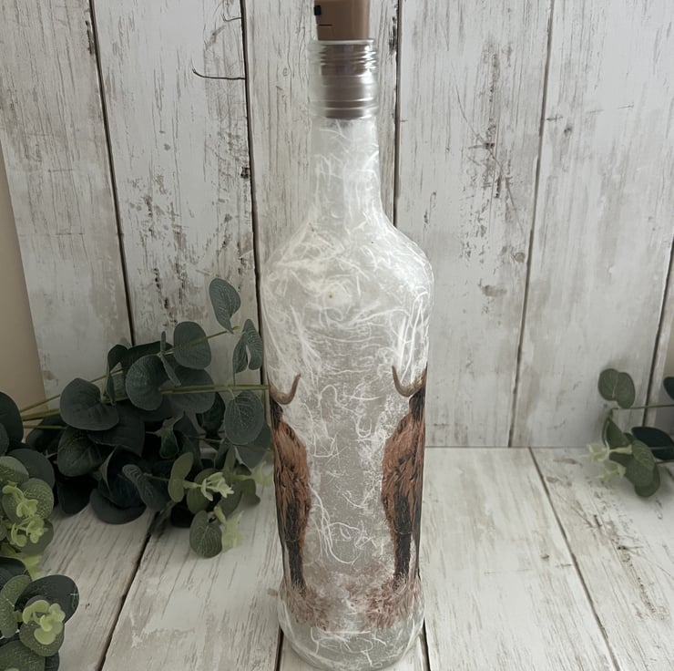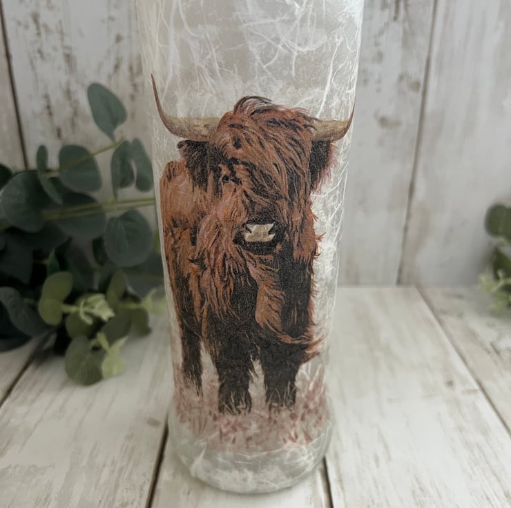 The bottle has been decorated using a textured technique and decoupaged with a lovely highland cow design to both sides. The bottle has been finished with several coats of heat and water resistant varnish for protection.