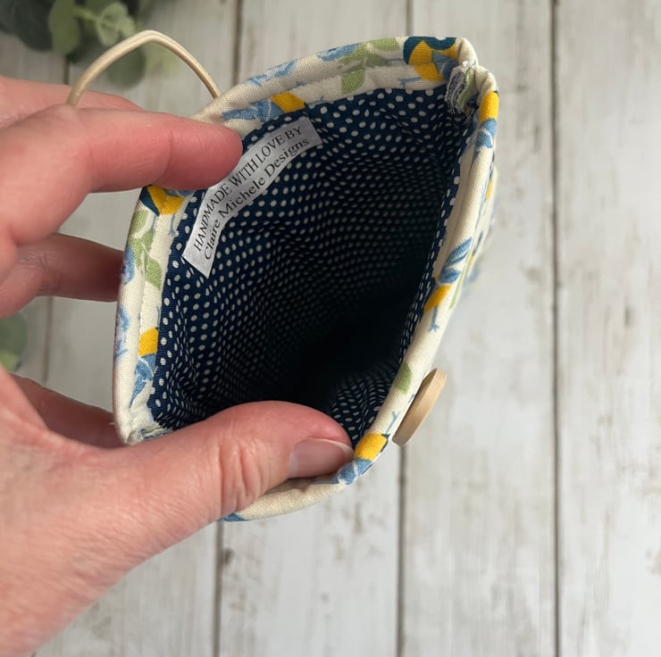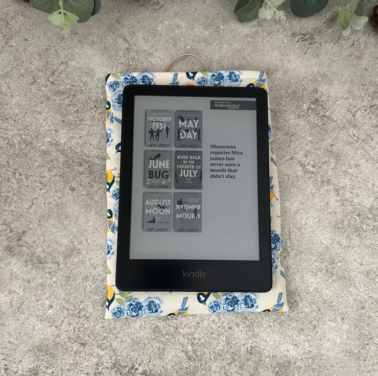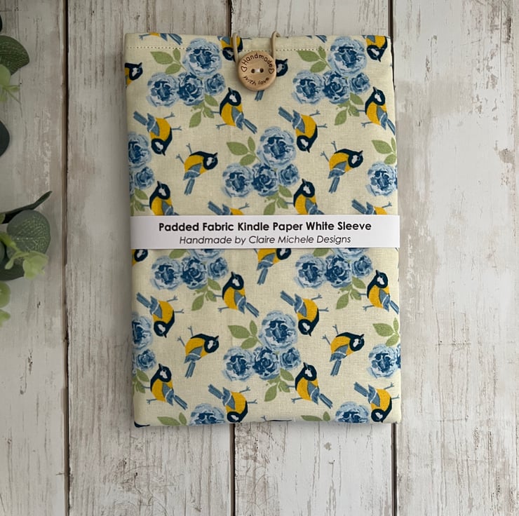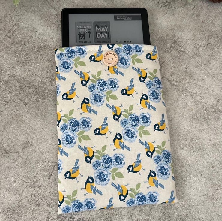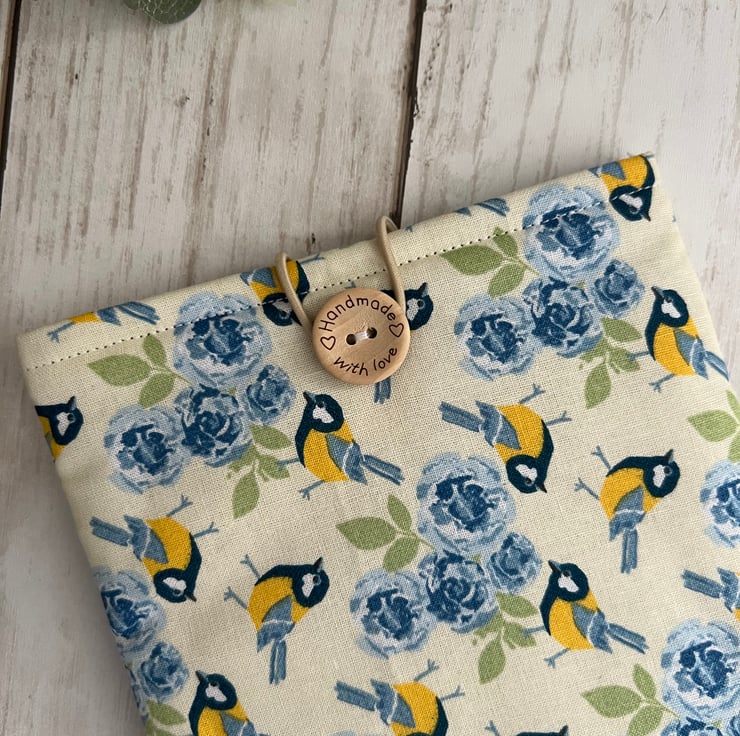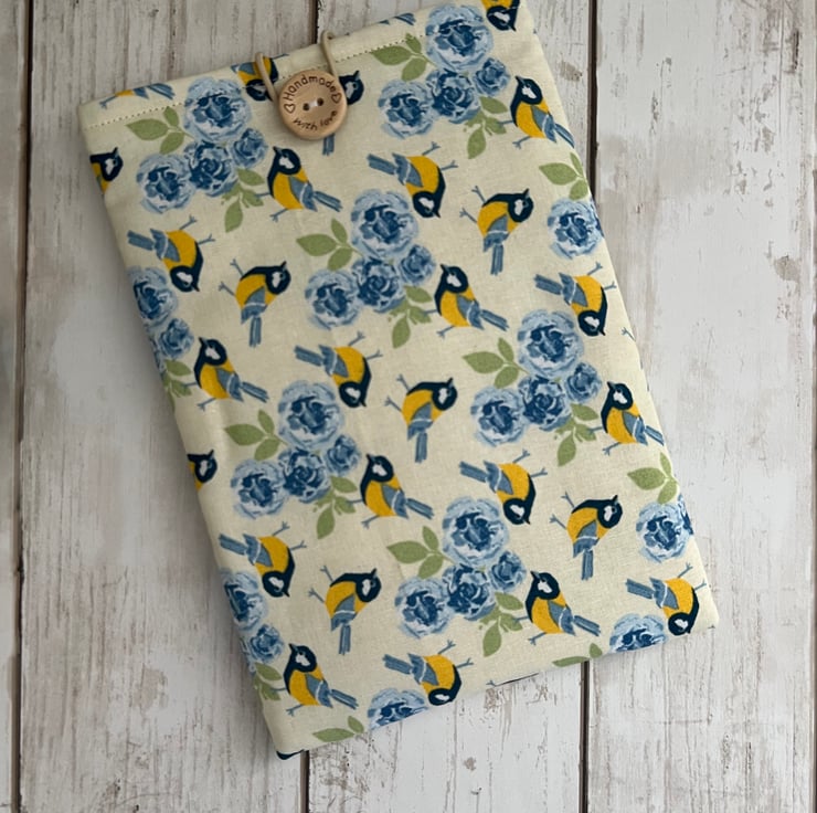 Made from 100% cotton fabric, these padded covers are made with two co-ordinating fabrics, the outer design is a lovely blue tit design and the inner fabric is polka dot navy blue. They are gently padded with wadding and have two buttons either side with a co-ordinated elastic to keep your Kindle protected, especially useful whilst travelling.